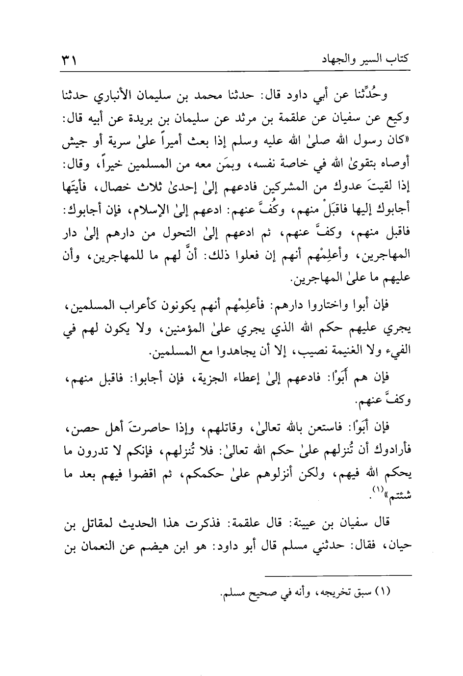 وحدثنا عن أبي داود قال: حدثنا محمد بن سليمان الأنباري حدثنا وكيع عن سفيان عن علقمة بن مرثد عن سليمان بن بريدة عن أبيه قال: "كان رسول الله صلى الله عليه وسلم إذا بعث أميرًا على سرية أو جيش أوصاه بتقوى الله في خاصة نفسه، وبمن معه من المسلمين خيرًا، وقال: إذا لقيت عدوك من المشركين فادعهم إلى إحدى ثلاث خصال، فأيتها أجابوك إليها فاقبل منهم، وكف عنهم: ادعهم إلى الإسلام، فإن أجابوك: فاقبل منهم، وكف عنهم، ثم ادعهم إلى التحول م دارهم إلى دار المهاجرين، وأعلمهم أنهم إن فعلوا ذلك: أن لهم ما للمهاجرين، وأن عليهم ما على المهاجرين.
