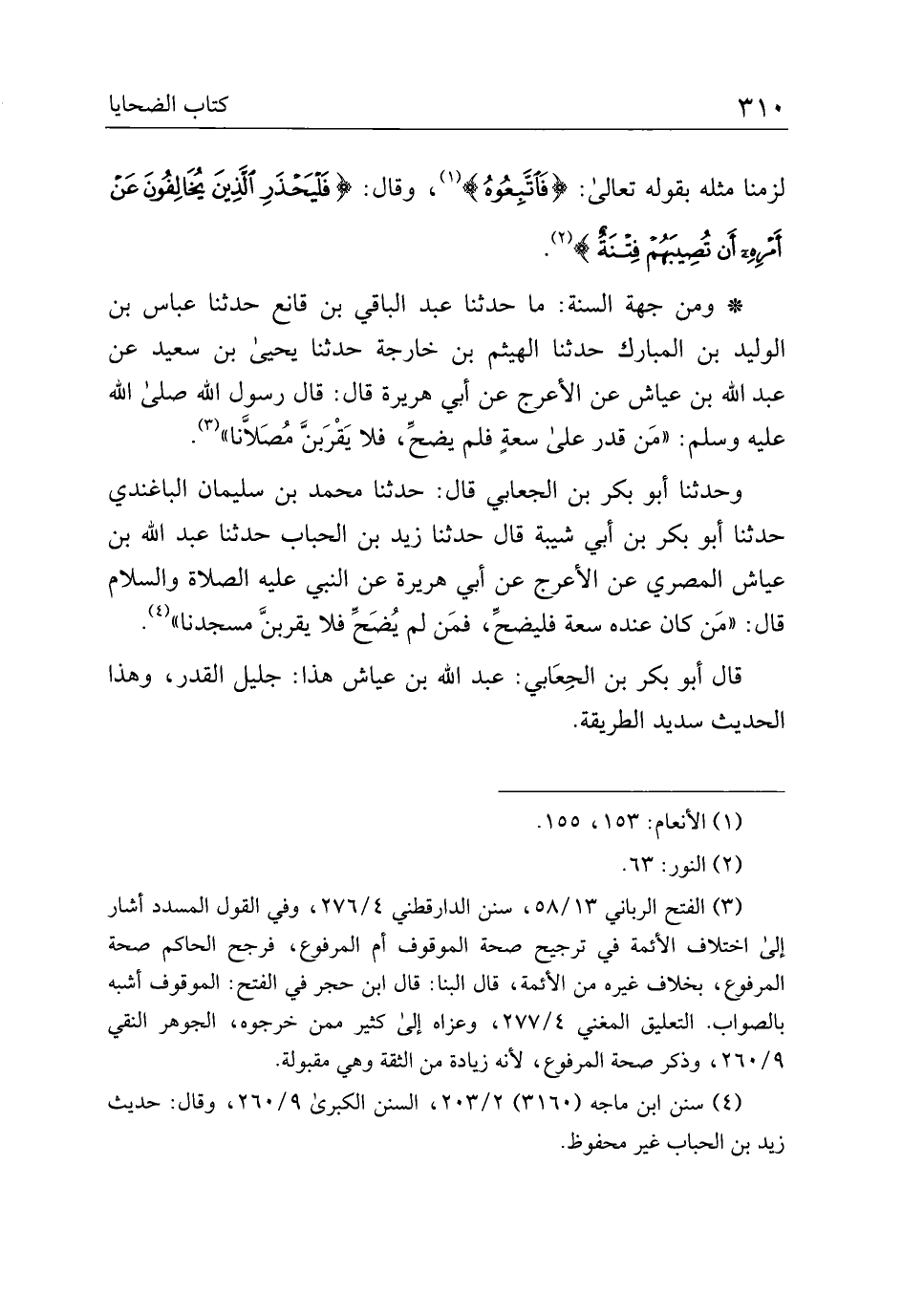 وحدثنا أبو بكر بن الجعابي قال: حدثنا محمد بن سليمان الباغندي حدثنا أبو بكر بن أبي شيبة قال حدثنا زيد بن الحباب حدثنا عبد الله بن عياش المصري عن الأعرج عن أبي هريرة عن النبي عليه الصلاة والسلام قال: "من كان عنده سعة فليضح، فمن لم يضح فلا يقربن مسجدنا".