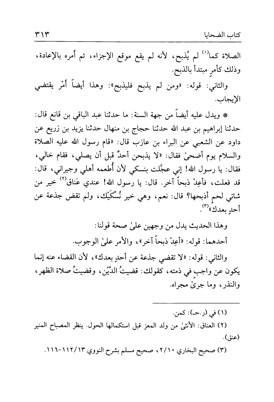 * ويدل عليه أيضًا من جهة السنة: ما حدثنا عبد الباقي بن قانع قال: حدثنا إبراهيم بن عبد الله حدثنا حجاج بن منهال حدثنا يزيد بن زريع عن داود عن الشعبي عن البراء بن عازب قال: "قام رسول الله عليه الصلاة والسلام يوم أضحى فقال: "لا يذبحن أحدٌ قبل أن يصلي، فقام خالي، فقال: يا رسول الله! إنى عجلت بنسكي لأن أطعمه أهلي وجيراني، قال: قد فعلت، فأعد ذبحًا آخر. قال: يا رسول الله! عندى عناق خير من شاتي لحم أذبحها؟ قال: نعم، وهي خير نسكيك، ولم تقض جذعة عن أحدٍ بعدك".