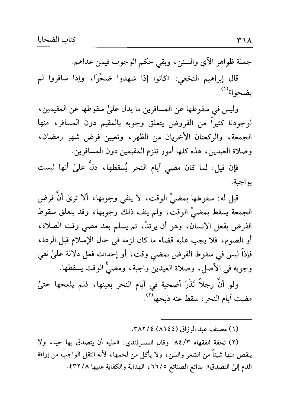 قال إبراهيم النخعي: "كانوا إذا شهدوا ضحوا، وإذا سافروا لم يضحوا".