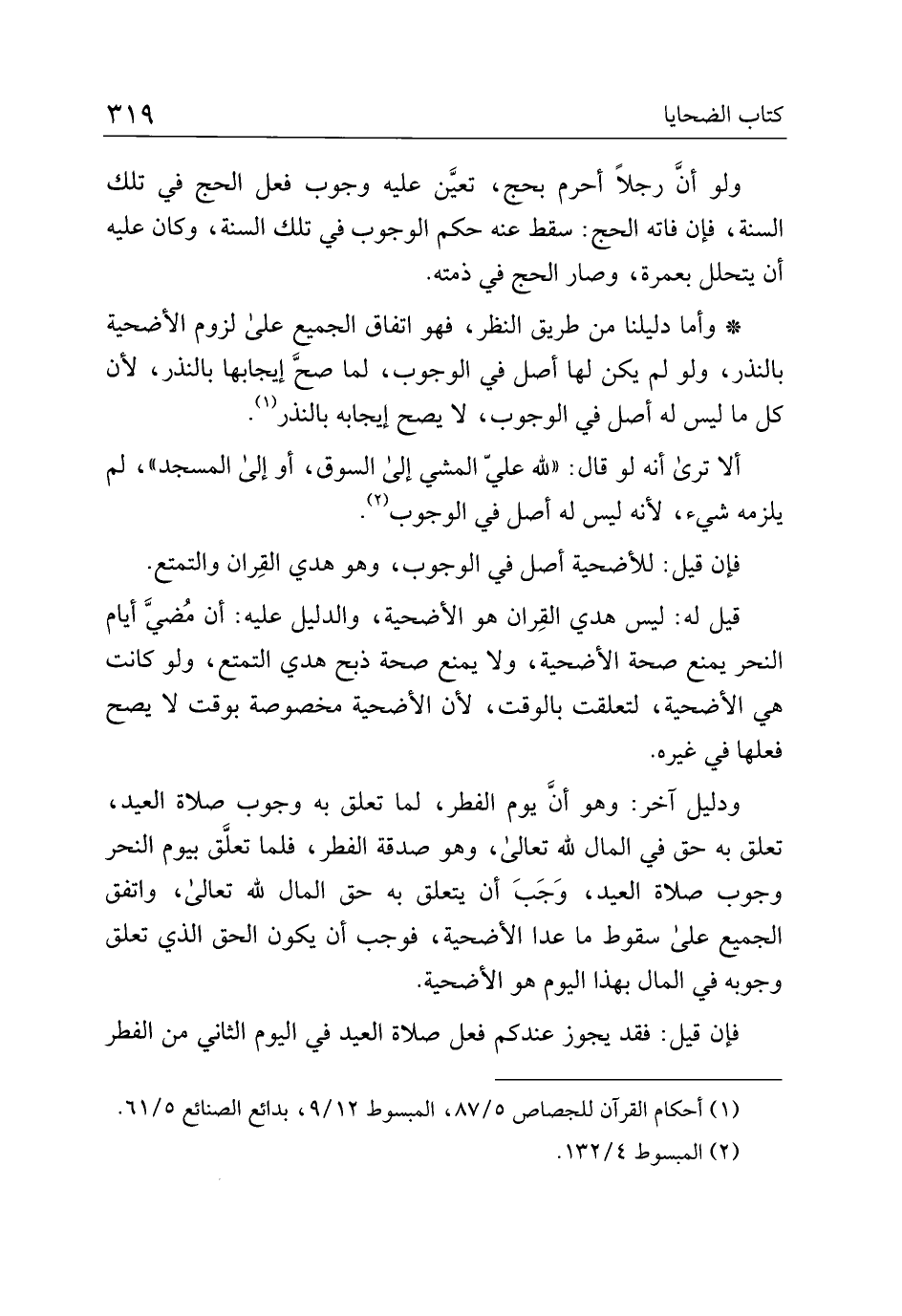 * وأما دليلنا من طريق النظر، فهو اتفاق الجميع على لزوم الأضحية بالنذر، ولو لم يكن لها أصل في الوجوب، لما صح إيجابها بالنذر، لأن كل ما ليس له أصل في الوجوب، لا يصح إيجابه بالنذر.