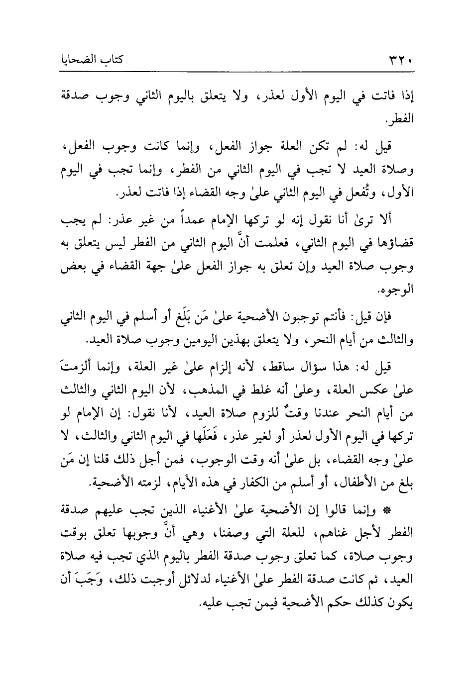 قيل له: هذا سؤال ساقط، لأنه إلزام على غير العلة، وإنما ألزمت على عكس العلة، وعلى أنه غلط في المذهب، لأن اليوم الثاني والثالث من أيام النحر عندنا وقت للزوم صلاة العيد، لأنا نقول: إن الإمام لو تركها في اليوم الأول لعذر أو لغير عذر، فعلها في اليوم الثاني والثالث، لا على وجه القضاء، بل على أنه وقت الوجوب، فمن أجل ذلك قلنا إن من بلغ من الأطفال، أو أسلم من الكفار في هذه الأيام، لزمته الأضحية.