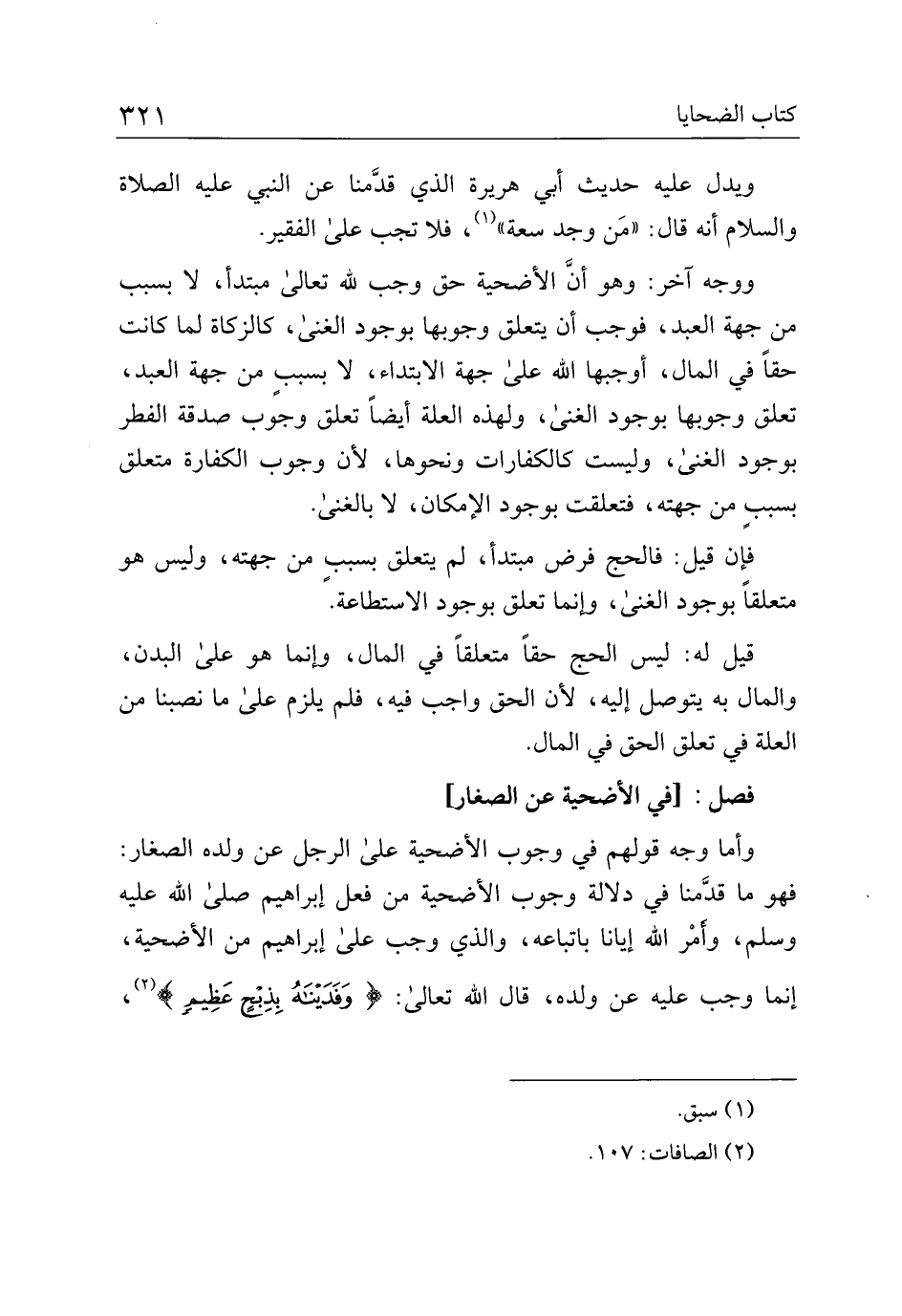 ووجه آخر: وهو أنَّ الأضحية حق وجب لله تعالى مبتدأ، لا بسبب من جهة العبد، فوجب أن يتعلق وجوبها بوجود الغنى، كالزكاة لما كانت حقًا في المال، أوجبها الله على جهة الابتداء، لا بسبب من جهة العبد، نعلق وجوبها بوجود الغنى، ولهذه العلة أيضًا وجوب صدقة الفطر بوجود الغنى، وليست كالكفارات ونحوها، لأن وجوب الكفارة متعلق بسببٍ من جهته، فتعلقت بوجود الإمكان، لا بالغنى.