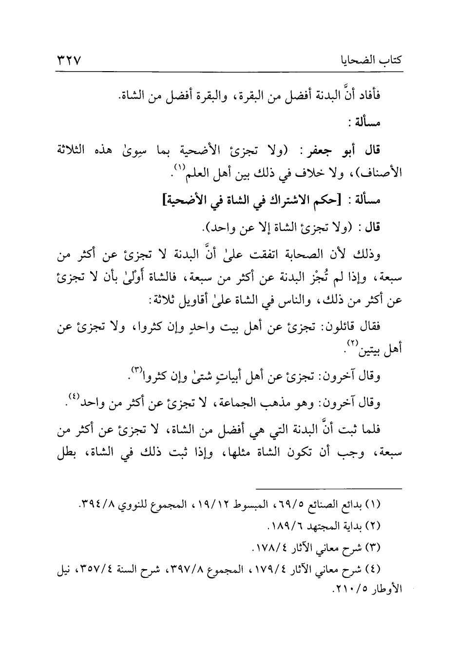 وذلك لأن الصحابة اتفقت على أنَّ البدنة لا تجزئ عن أكثر من سبعة، وإذا لم تجز البدنة عن أكثر من سبعة، فالشاة أولى بأن لا تجزئ عن أكثر من ذلك، والناس في الشاة على أقاويل ثلاثة: