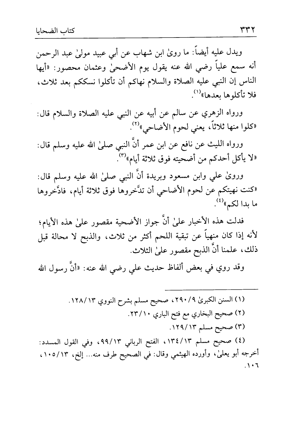 ويدل عليه أيضًا: ما روى ابن شهاب عن أبي عبيد مولى عبد الرحمن أنه سمع عليًا رضي الله عنه يقول يوم الأضحى وعثمان محصور: "أيها الناس إن النبي عليه الصلاة والسلام نهاكم أن تأكلوا نسككم بعد ثلاث، فلا تأكلوها بعدها".