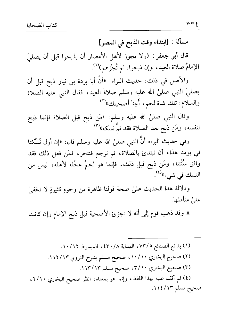 قال أبو جعفر: (ولا يجوز لأهل الأمصار أن يذبحوا قبل أن يصلي الإمام صلاة العيد، وإن ذبحوا: لم تجزهم).