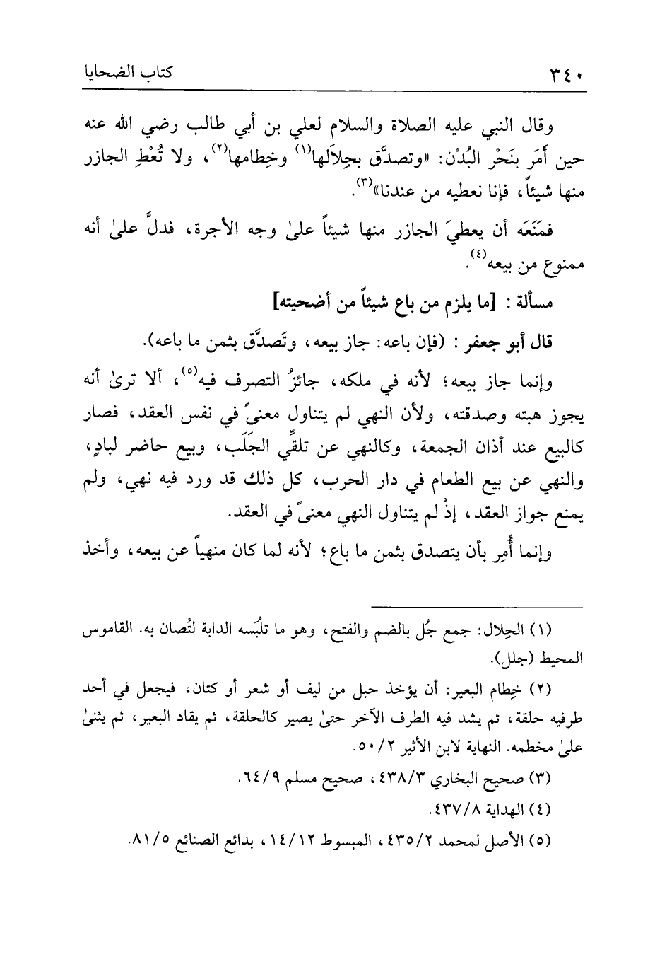 وقال النبي عليه الصلاة والسلام لعلي بن أبي طالب رضي الله عنه حين أمر بنحر البدن: "وتصدق بحلالها وخطامها، ولا تعط الجازر منها شيئًا، فإنا نعطيه من عندنا".