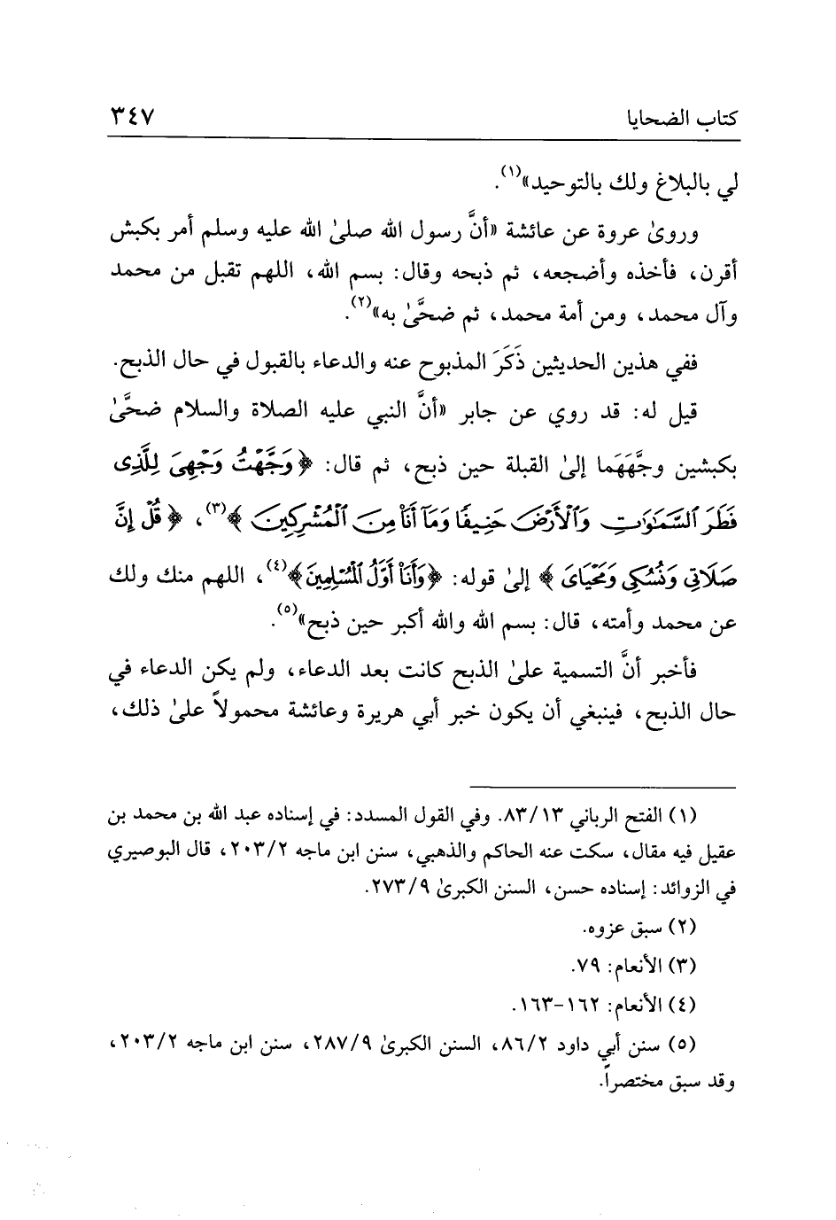 قيل له: قد روى عن جابر "أنَّ النبي عليه الصلاة والسلام ضحى بكبشين وجههما إلى القبلة حين ذبح، ثم قال: {وجهت وجهي للذي فطر السموات والأرض حنيفًا وما أنا من المشركين}، {قل إنَّ صلاتي ونسكى ومحياي} إلى قوله: {وأنا أول المسلمين}، اللهم منك ولك عن محمد وأمته، قال: بسم الله والله أكبر حين ذبح".