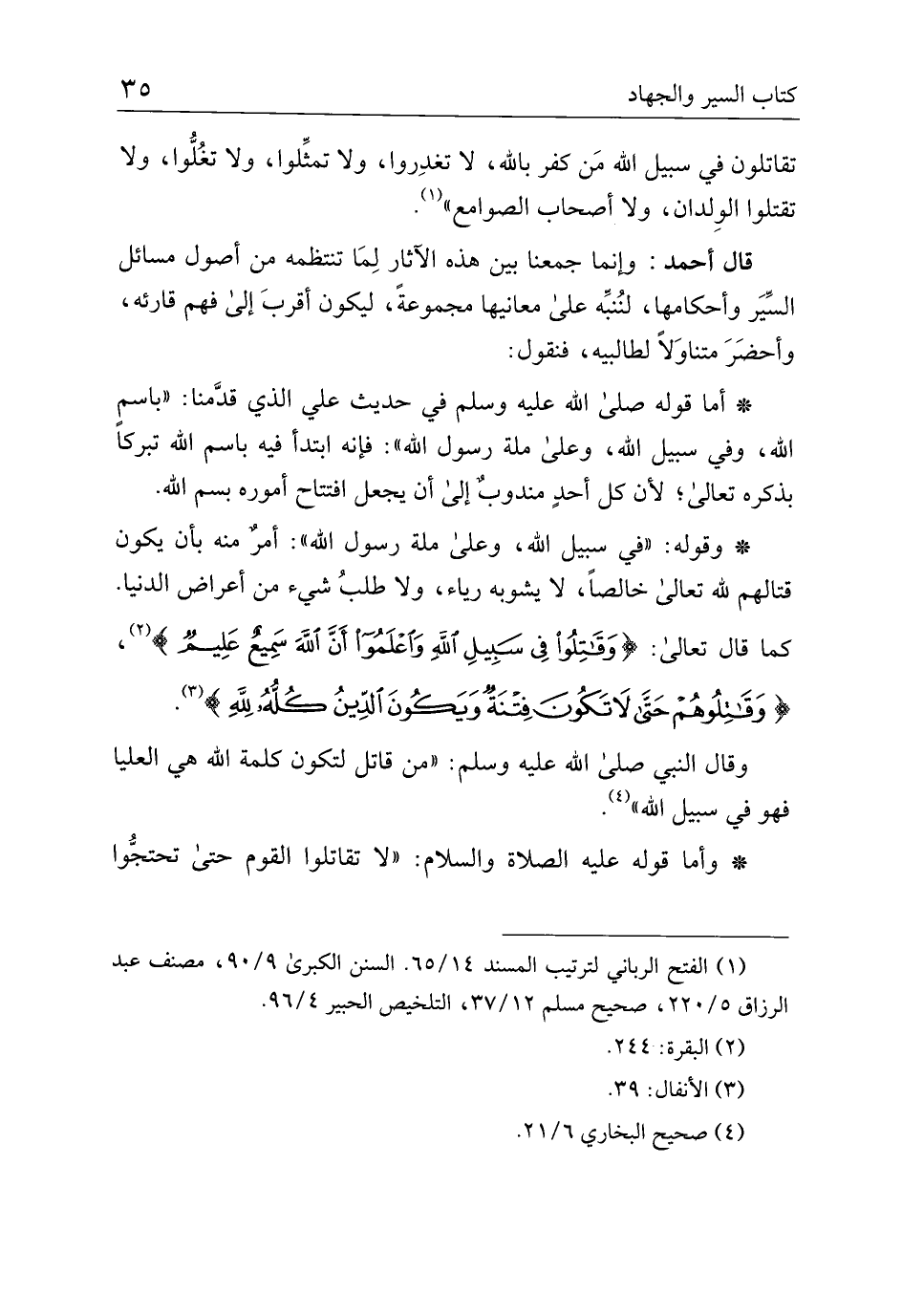 قال أحمد: وإنما جمعنا بين هذه الآثار لما تنتظمه من أصول مسائل السير وأحكامها، لننبه على معانيها مجموعة، ليكون أقرب إلى فهم قارئه، وأحضر متناولًا لطالبيه، فنقول: