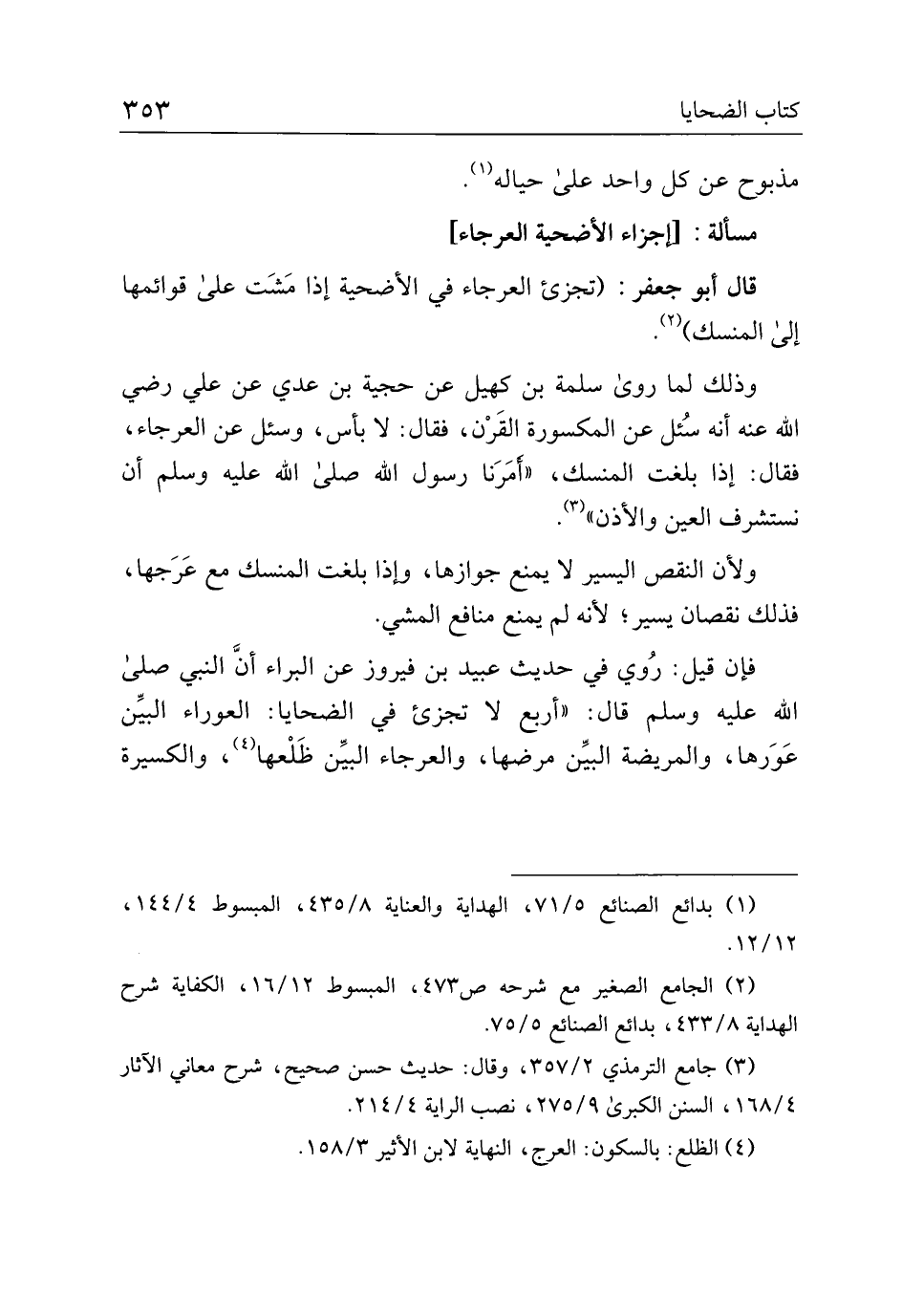 وذلك لما روى سلمة بن كهيل عن حجية بن عدى عن على رضي الله عنه أنه سئل عن المكسورة القرن، فقال: لا بأس، وسئل عن العرجاء، فقال: إذا بلغت المنسك، "أمرنا رسول الله صلى الله عليه وسلم أن نستشرف العين والأذن".