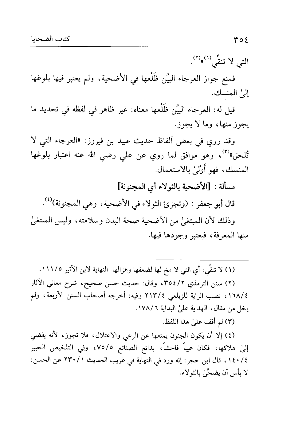 وقد روي في بعض ألفاظ حديث عبيد بن فيروز: "العرجاء التي لا تلحق"، وهو موافق لما روي عن علي رضي الله عنه اعتبار بلوغها المنسك، فهو أولى بالاستعمال.