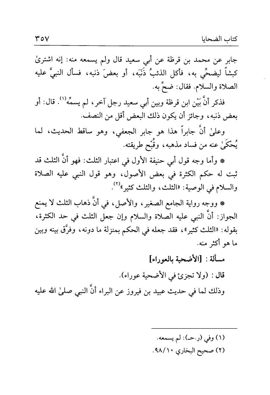 جابر عن محمد بن قرظة عن أبي سعيد قال ولم يسمعه منه: إنه اشترى كبشًا ليضحي به، فأكل الذئب ذنبه، أو بعض ذنبه، فسأل النبي عليه الصلاة والسلام. فقال: ضح به.