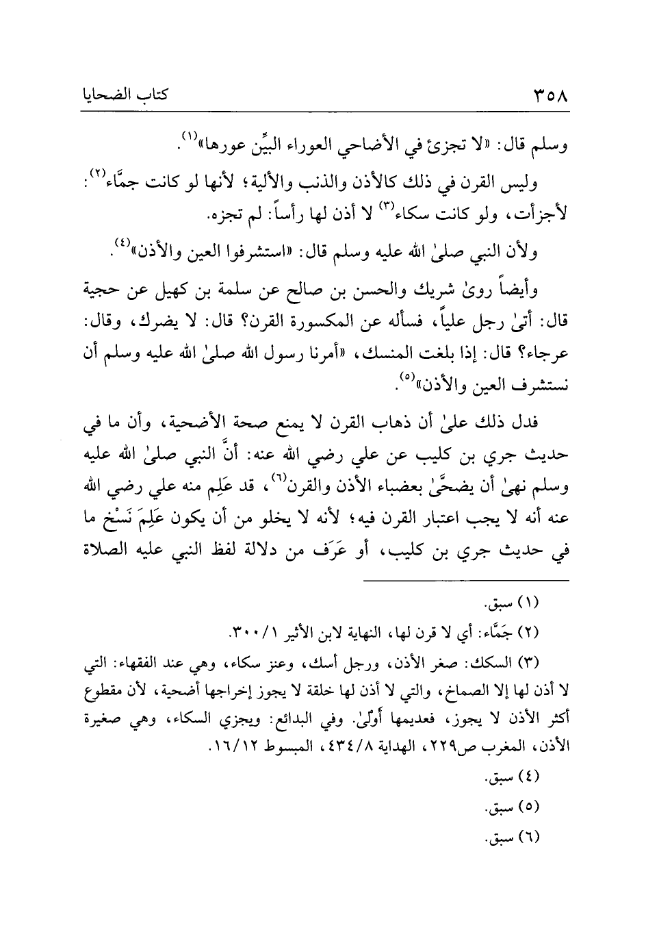 وأيضًا روى شريك والحسن بن صالح عن سلمة بن كهيل عن حجية قال: أتى رجل عليًا، فسأله عن المكسورة القرن؟ قال: لا يضرك، وقال: عرجاء؟ قال: إذا بلغت المنسك، "أمرنا رسول الله صلى الله عليه وسلم أن نستشرف العين والأذن".