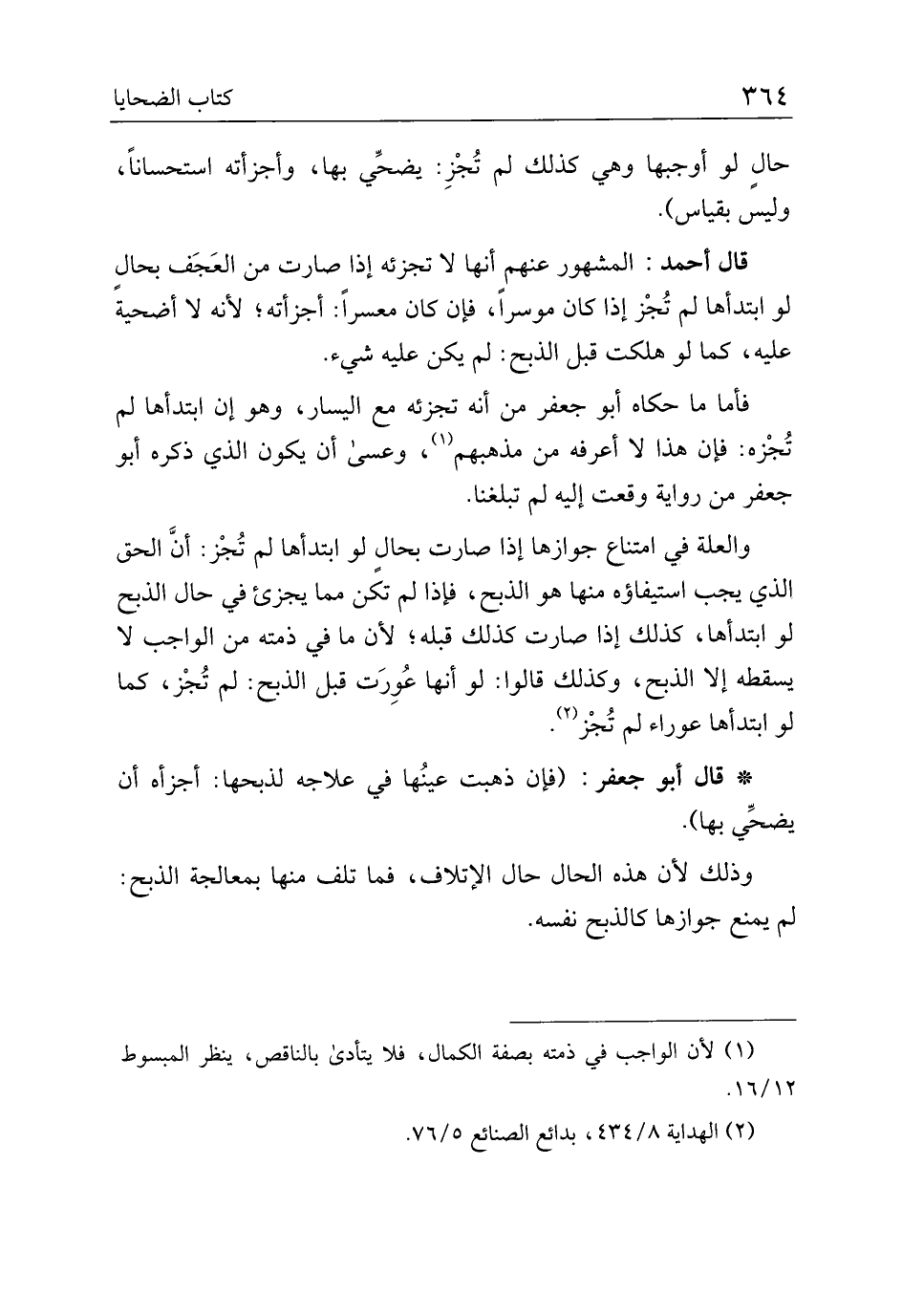 حالٍ لو أوجبها وهي كذلك لم تُجزِ: يضحي بها، وأجزأته استحسانًا، وليس بقياس).