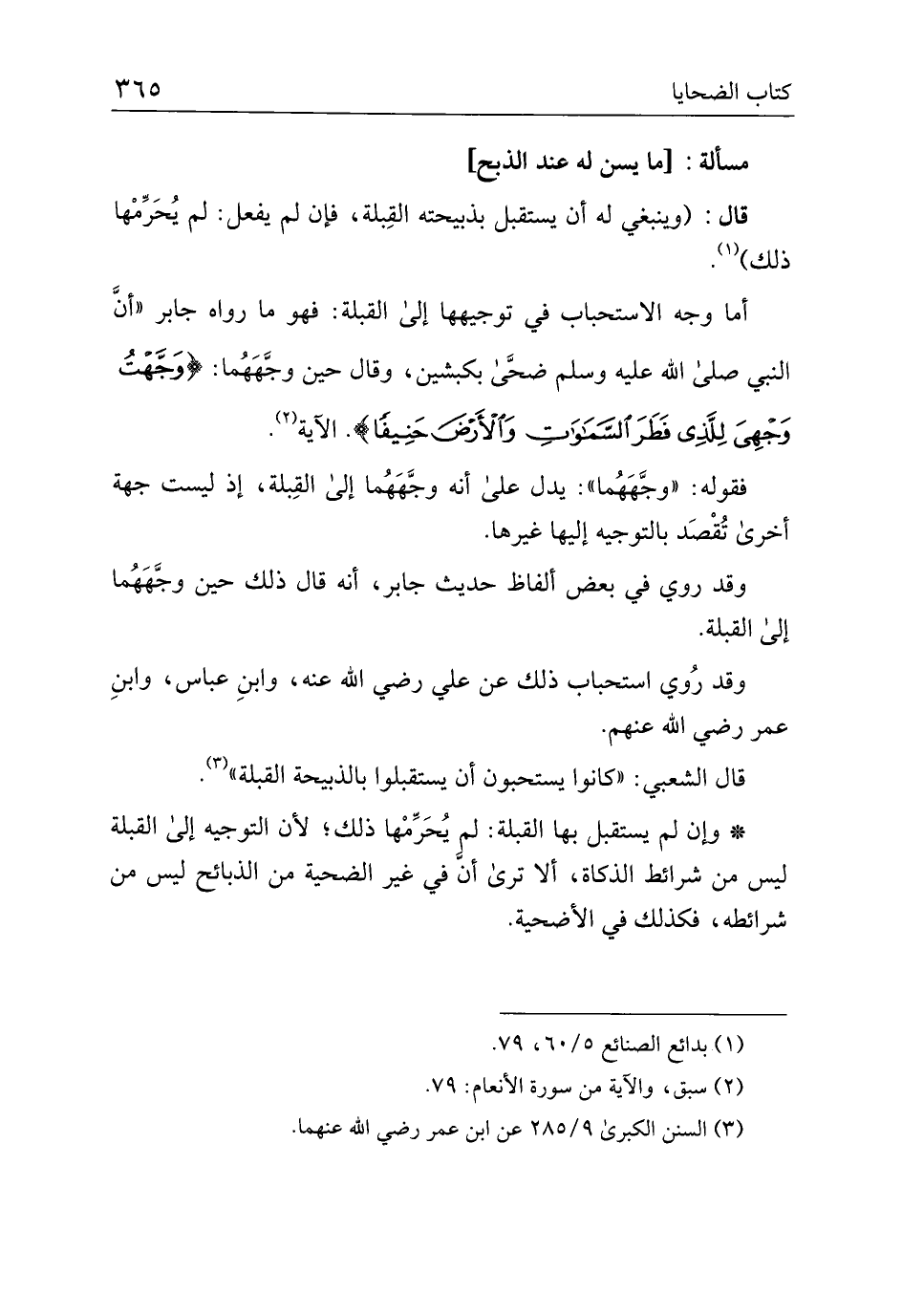 قال الشعبي: "كانوا يستحبون أن يستقبلوا بالذبيحة القبلة".