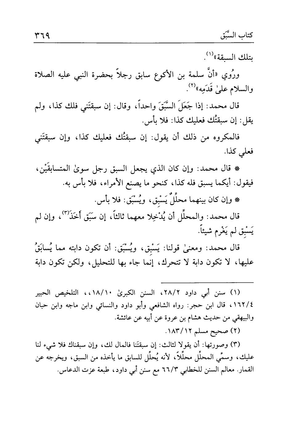 قال محمد: ومعنى قولنا: يَسبِق، ويُسبَق: أن تكون دابته مما يُسابق عليها، لا تكون دابة لا تتحرك، إنما جاء بها للتحليل، ولكن تكون دابة