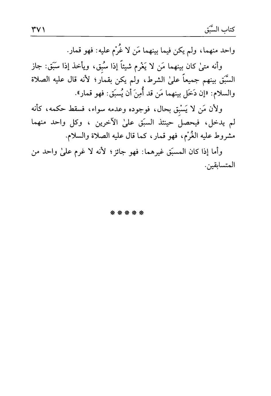 وأنه متى كان بينهما من لا يَغرم شيئَا إذا سُبِق، ويأخذ إذا سَبَق: جاز السبق بينهم جميعًا على الشرط، ولم يكن بقمار؛ لأنه قال عليه الصلاة والسلام: "إن دخل بينهما من قد أمن أن يُسبق: فهو قمار".
