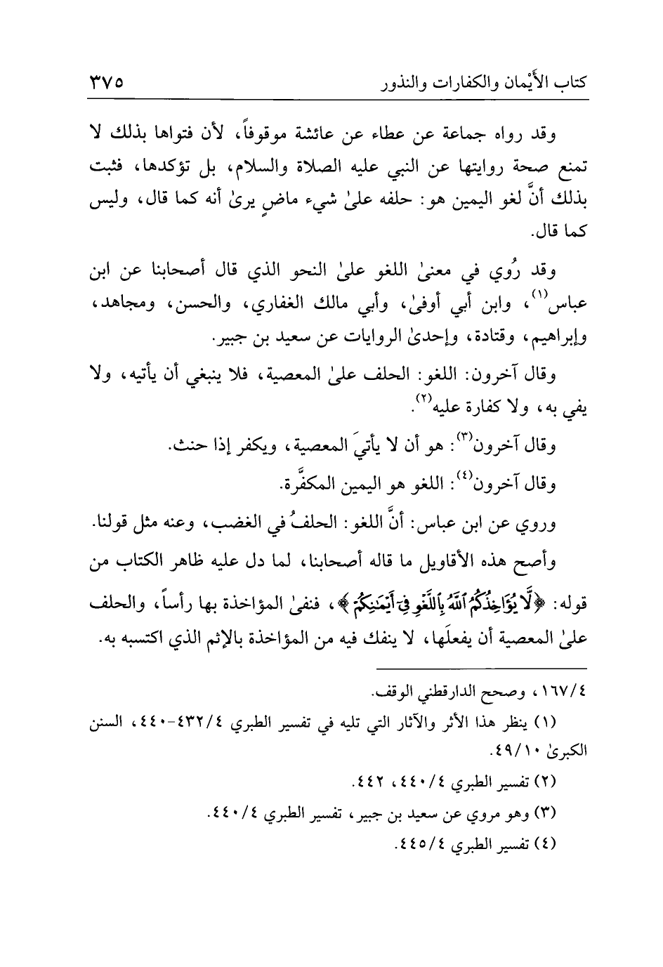 وقد رواه جماعة عن عطاء عن عائشة موقوفًا، لأن فتواها بذلك لا تمنع صحة روايتها عن النبي عليه الصلاة والسلام، بل تؤكدها، فثبت بذلك أنَّ لغو اليمين هو: حلفه على شيء ماضٍ يرى أنه كما قال، وليس كما قال.