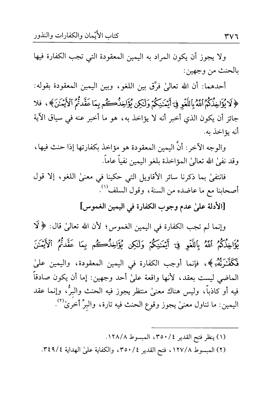 والوجه الآخر: أنَّ اليمين المعقودة هو مؤاخذ بكفارتها إذا حنث فيها، وقد نفى الله تعالى المؤاخذة بلغو اليمين نفيًا عامًا.