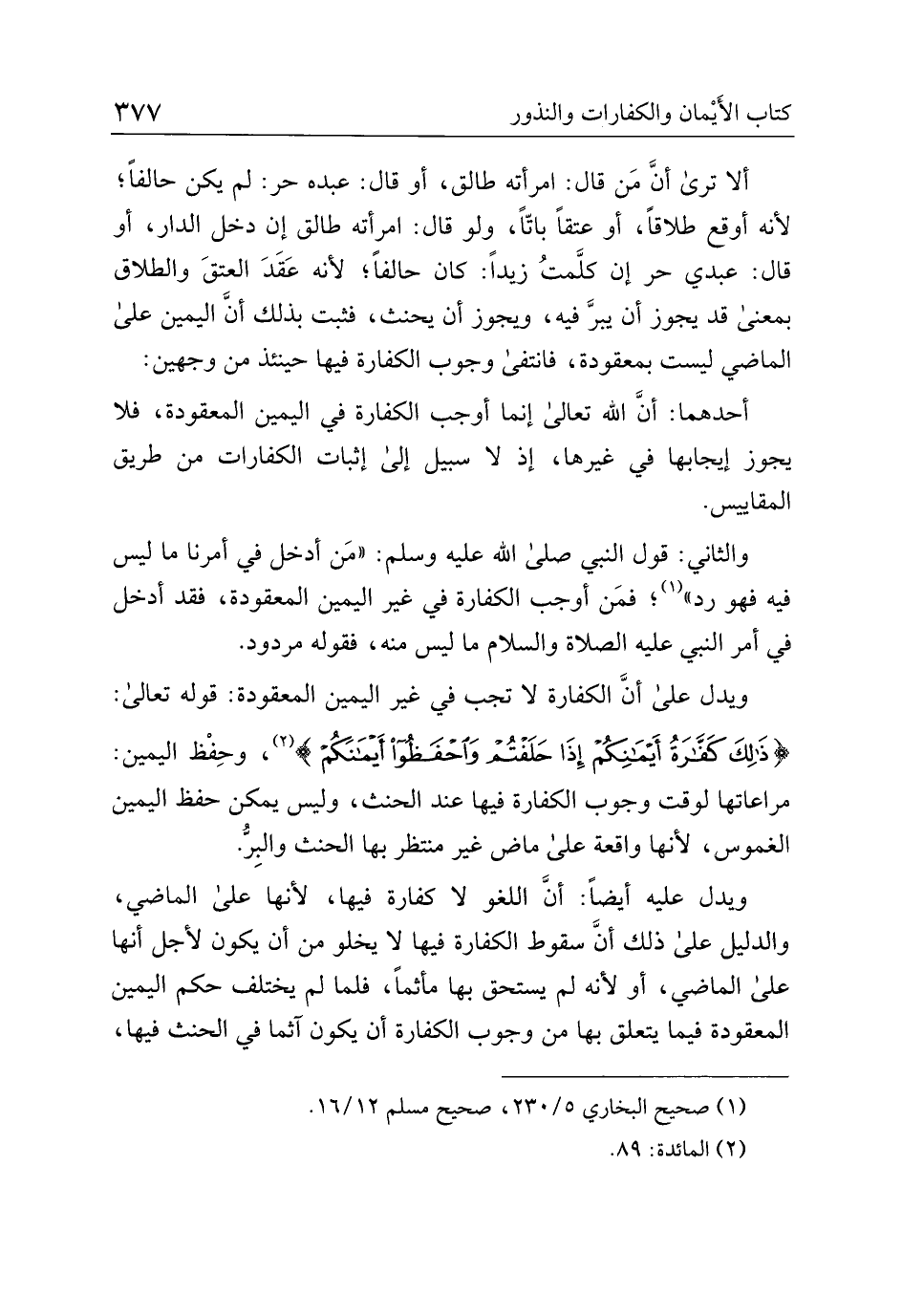 والثاني: قول النبي صلى الله عليه وسلم: "من أدخل في أمرنا ما ليس فيه فهو رد"؛ فمن أوجب الكفارة في غير اليمين المعقودة، فقد أدخل في أمر النبي عليه الصلاة والسلام ما ليس منه، فقوله مردود.