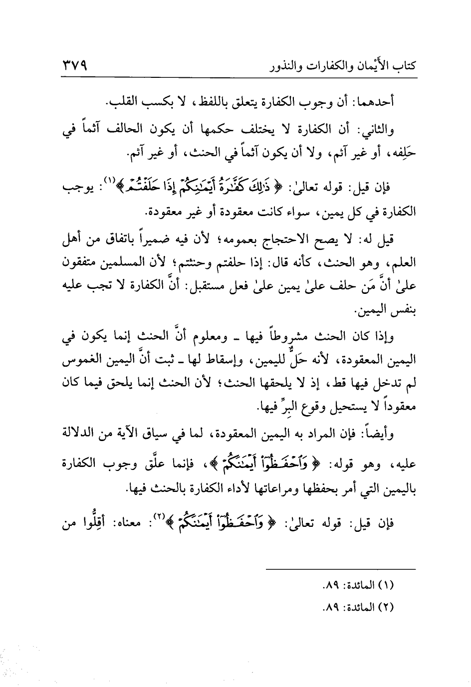 وأيضًا: فإن المراد به اليمين المعقودة، لما في سياق الآية من الدلالة عليه، وهو قوله: {واحفظوا أيمانكم}، فإنما علَّق وجوب الكفارة باليمين التي أمر بحفظها ومراعاتها لأداء الكفارة بالحنث فيها.