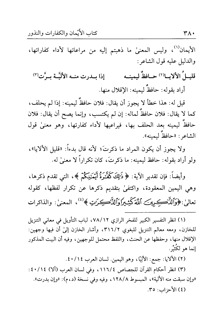 ولا يجوز أن يكون المراد ما ذكرت؛ لأنه قال بدءًا: "قليل الألايا"، ولو أراد بقوله: حافظ ليمينه: ما ذكرت، كان تكرارًا لا معنى له.