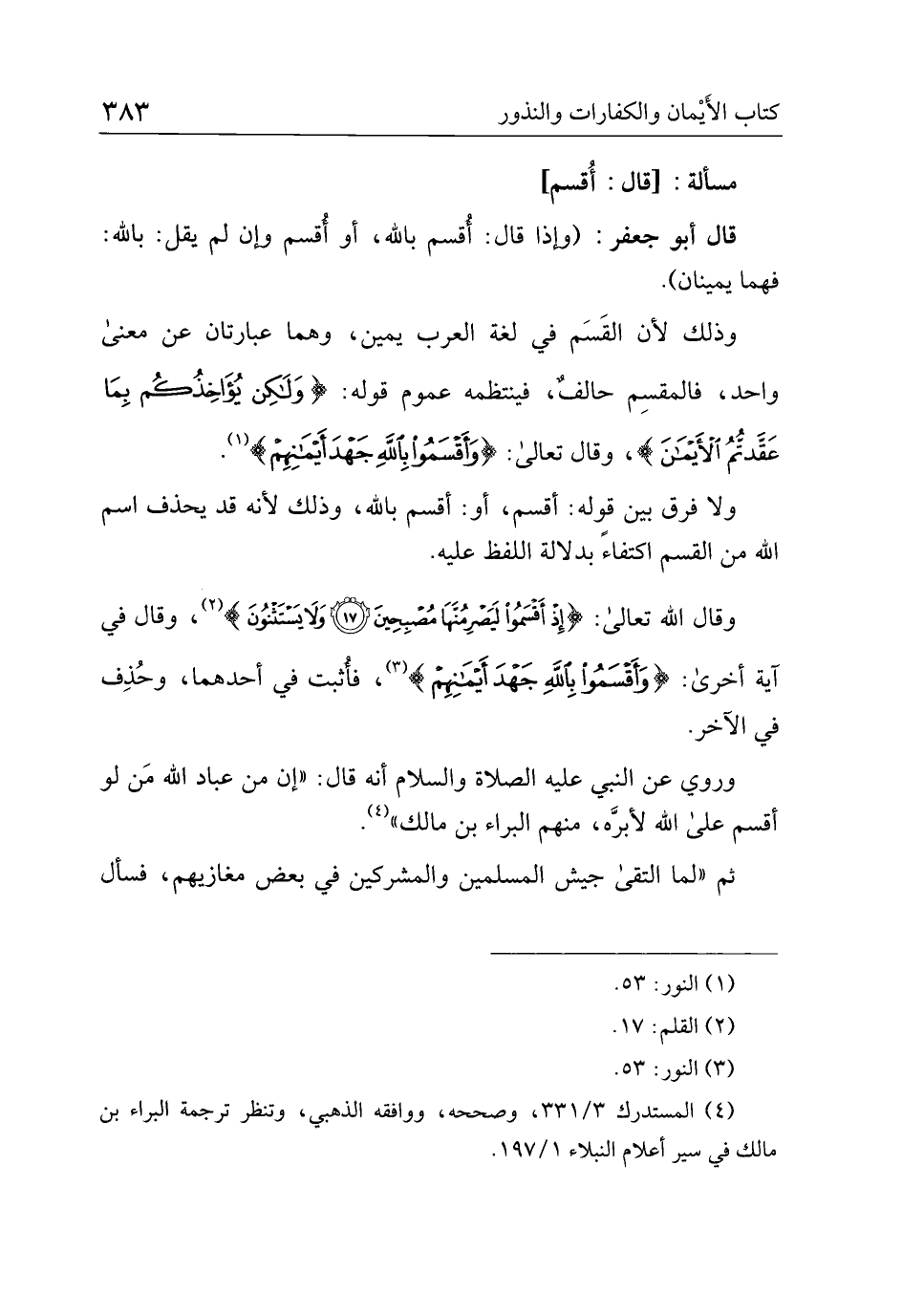 قال أبو جعفر: (وإذا قال: أقسم بالله، أو أقسم وإن لم يقل: بالله: فهما يمينان).