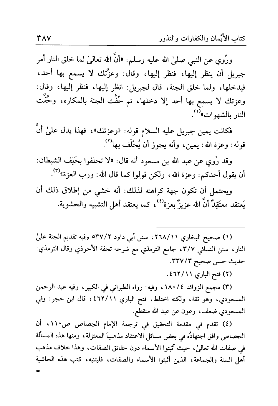 وقد رُوي عن عبد الله بن مسعود أنه قال: "لا تحلفوا بحلف الشيطان: أن يقول أحدكم: وعزة الله، ولكن قولوا كما قال الله: ورب العزة".