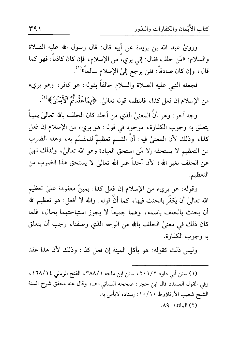 فجعله النبي عليه الصلاة والسلام حالفًا بقوله: هو كافر، وهو بريء من الإسلام إن فعل كذا، فانتظمه قوله تعالى: {بما عقدتم الأيمان}.