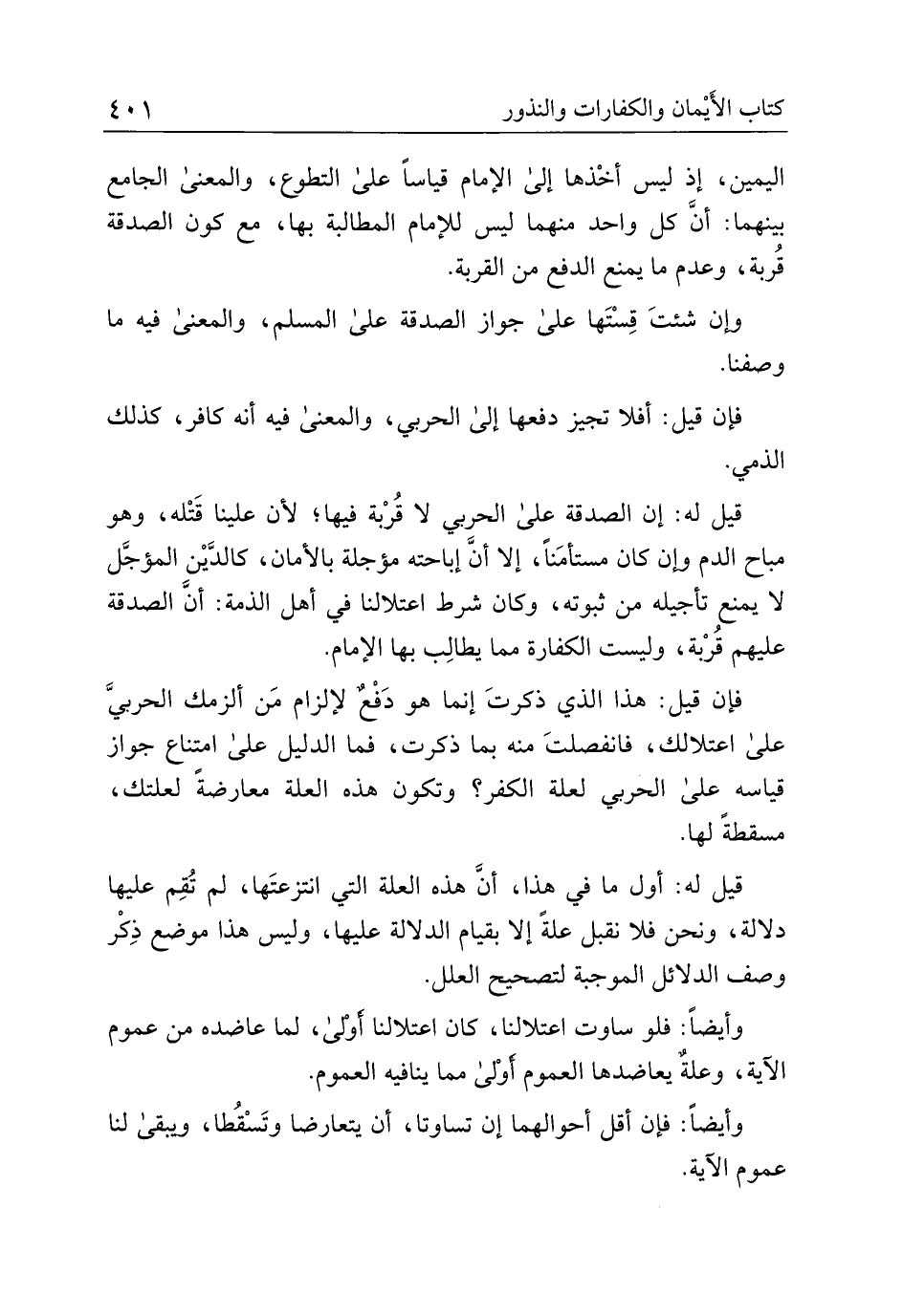 قيل له: إن الصدقة على الحربي لا قربة فيها؛ لأن علينا قتله، وهو مباح الدم وإن كان مستأمنًا، إلا أنَّ إباحته مؤجلة بالأمان، كالدين المؤجل لا يمنع تأجيله من ثبوته، وكان شرط اعتلالنا في أهل الذمة: أنَّ الصدقة عليهم قُربة، وليست الكفارة مما يطالب بها الإمام.