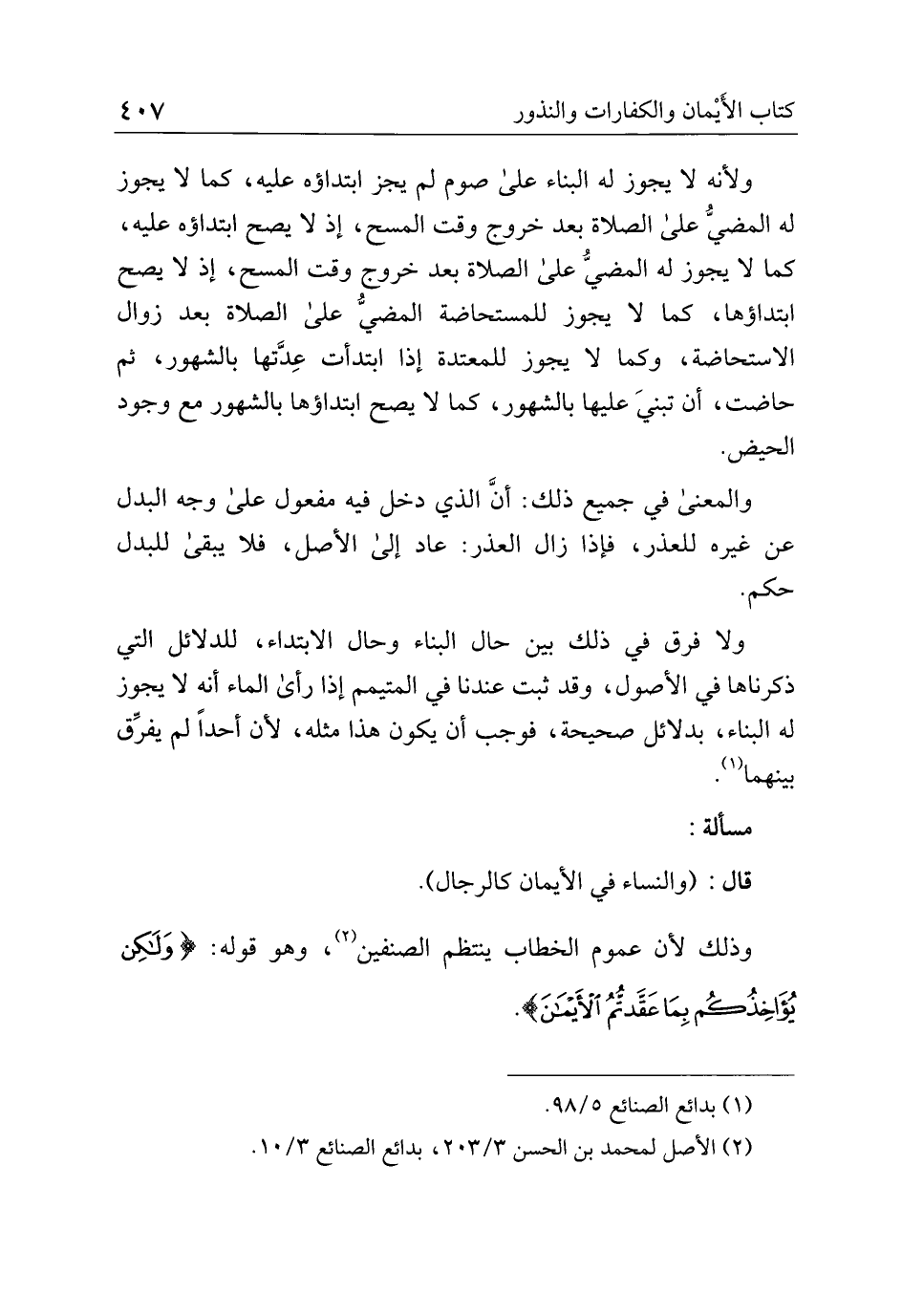 ولا فرق في ذلك بين حال البناء وحال الابتداء، للدلائل التي ذكرناها في الأصول، وقد ثبت عندنا في المتيمم إذا رأى الماء أنه لا يجوز له البناء، بدلائل صحيحة، فوجب أن يكون هذا مثله، لأن أحدًا لم يفرق بينهما.