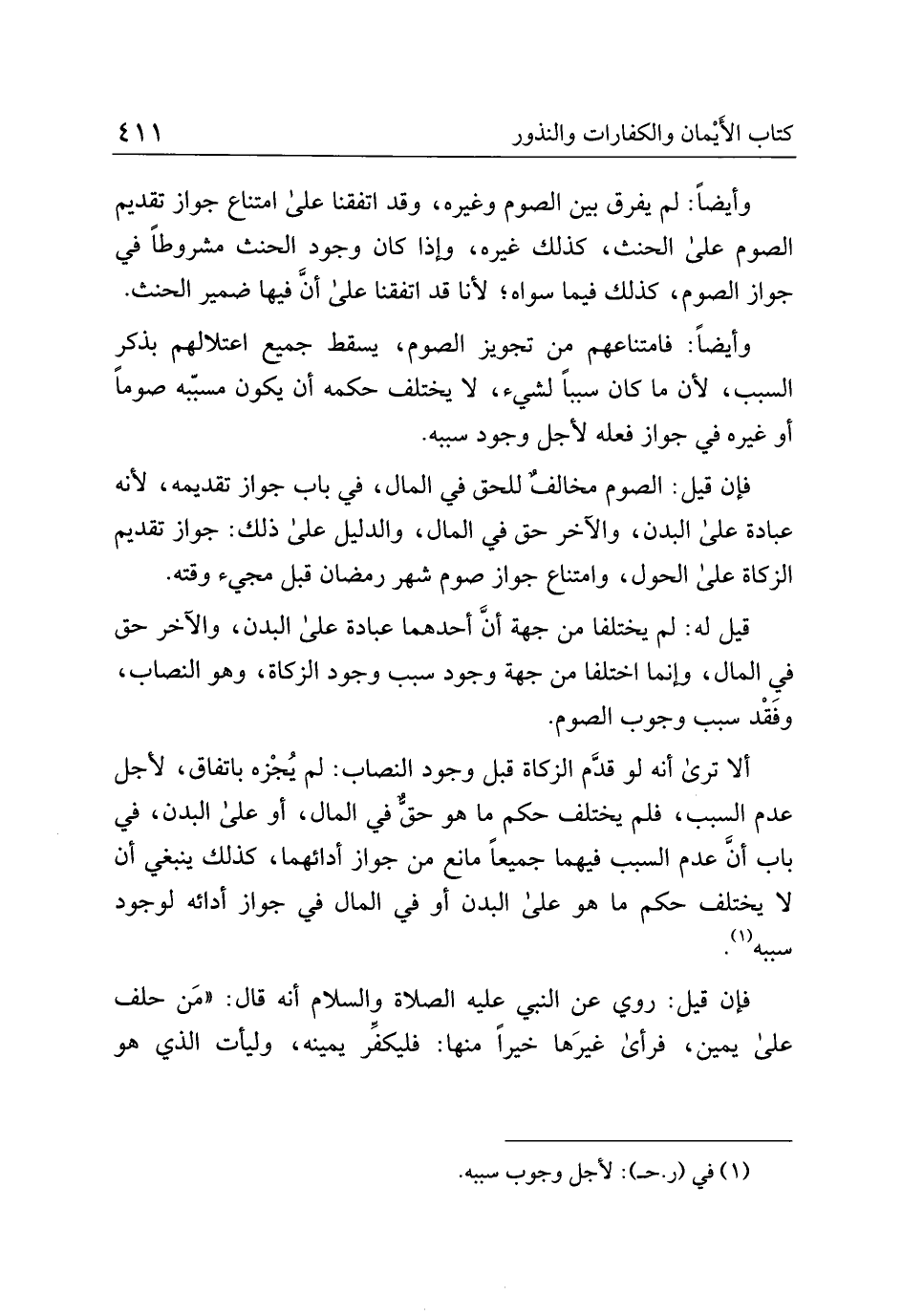 ألا ترى أنه لو قدَّم الزكاة قبل وجود النصاب: لم يُجزه باتفاق، لأجل عدم السبب، فلم يختلف حكم ما هو حقٌّ في المال، أو على البدن، في باب أنَّ عدم السبب فيهما جميعًا مانع من جواز أدائهما، كذلك ينبغي أن لا يختلف حكم ما هو على البدن أو في المال في جواز أدائه لوجود سببه.