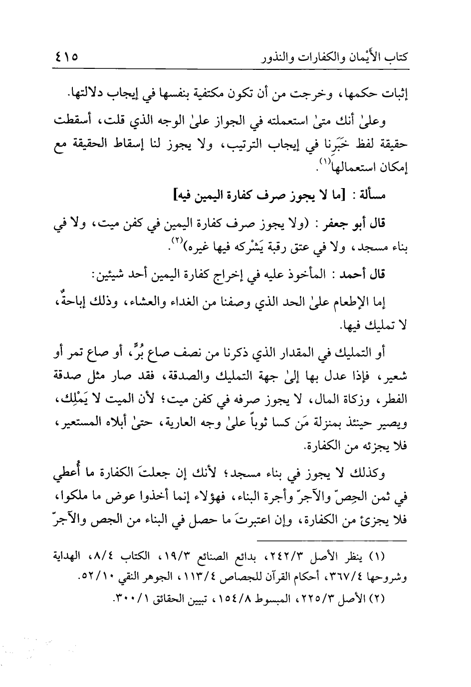 قال أبو جعفر: (ولا يجوز صرف كفارة اليمين في كفن ميت، ولا في بناء مسجد، ولا في عتق رقبة يشركه فيها غيره).