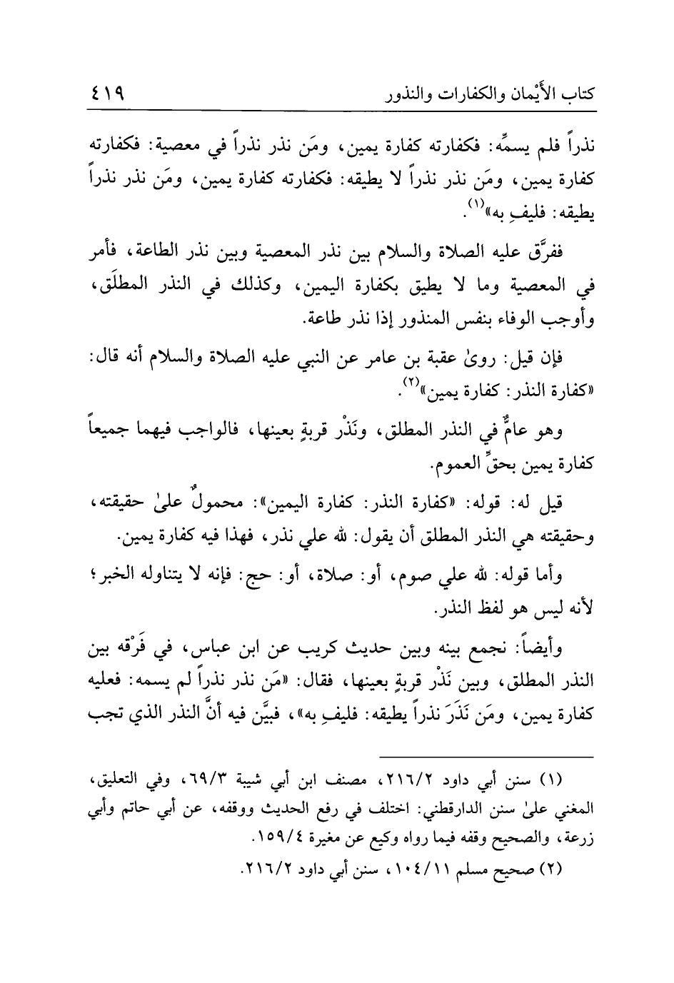 وأيضًا: نجمع بينه وبين حديث كريب عن ابن عباس، في فرقه بين النذر المطلق، وبين نذر قربةٍ بعينها، فقال: "من نذر نذرًا لم يسمه: فعليه كفارة يمين، ومن نذر نذرًا يطيقه: فليفِ به"، فبيَّن فيه أنَّ النذر الذي تجب