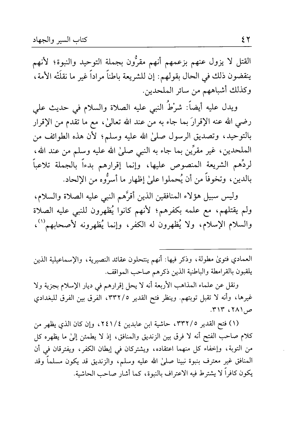 ويدل عليه أيضًا: شرط النبي عليه الصلاة والسلام في حديث علي رضي الله عنه الإقرار بما جاء به من عند الله تعالى، مع ما تقدم من الإقرار بالتوحيد، وتصديق الرسول صلى الله عليه وسلم؛ لأن هذه الطوائف من الملحدين، غير مقرين بما جاء به النبي صلى الله عليه وسلم من عند الله، لردهم الشريعة المنصوص عليها، وإنما إقرارهم بدءًا بالجملة تلاعبًا بالدين، وتخوفًا من أن يحملوا على إظهار ما أسروه من الإلحاد.