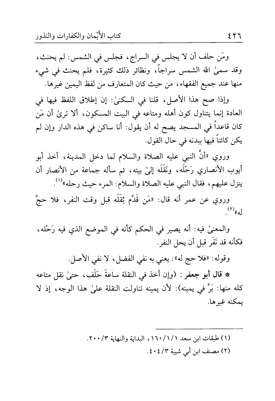ومن حلف أن لا يجلس في السراج، فجلس في الشمس: لم يحنث، وقد سمى الله الشمس سراجًا، ونظائر ذلك كثيرة، فلم يحنث في شيء منها عند جميع الفقهاء، من حيث كان المتعارف من لفظ اليمين غيرها.