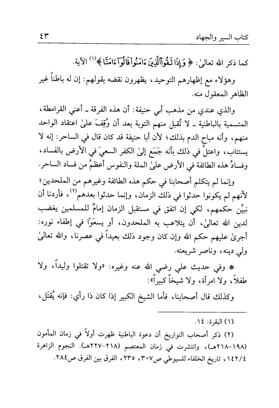 وإنما لم يتكلم أصحابنا في حكم هذه الطائفة وغيرهم من الملحدين؛ لأنهم لم يكونوا حدثوا في ذلك الزمان، وإنما حدثوا بعدهم، فأردنا أن نبين حكمهم، لكي إن اتفق في مستقبل الزمان إمام للمسلمين يغضب لدين الله تعالى، أن يتلاعب به الملحدون، أو يسعوا في إطفاء نوره: أجرى عليهم حكم الله وإن كان وجود ذلك بعيدًا في عصرنا، والله تعالى ولي دينه، وناصر شريعته.