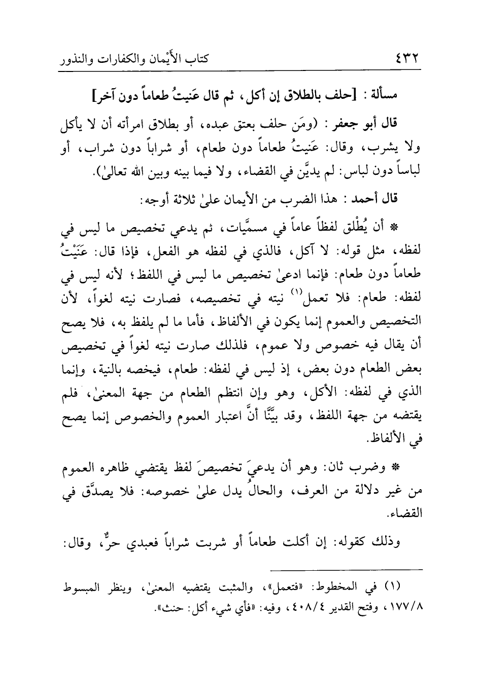 * أن يُطلق لفظًا عامًا في مسميات، ثم يدعي تخصيص ما ليس في لفظه، مثل قوله: لا آكل، فالذي في لفظه هو الفعل، فإذا قال: عنيت طعامًا دون طعام: فإنما ادعى تخصيص ما ليس في اللفظ؛ لأنه ليس في لفظه: طعام: فلا تعمل نيته في تخصيصه، فصارت نيته لغوًا، لأن التخصيص والعموم إنما يكون في الألفاظ، فأما ما لم يلفظ به، فلا يصح أن يقال فيه خصوص ولا عموم، فلذلك صارت نيته لغوًا في تخصيص بعض الطعام دون بعض، إذ ليس في لفظه: طعام، فيخصه بالنية، وإنما الذي في لفظه: الأكل، وهو وإن انتظم الطعام من جهة المعنى، فلم يقتضه من جهة اللفظ، وقد بيَّنَّا أنَّ اعتبار العموم والخصوص إنما يصح في الألفاظ.