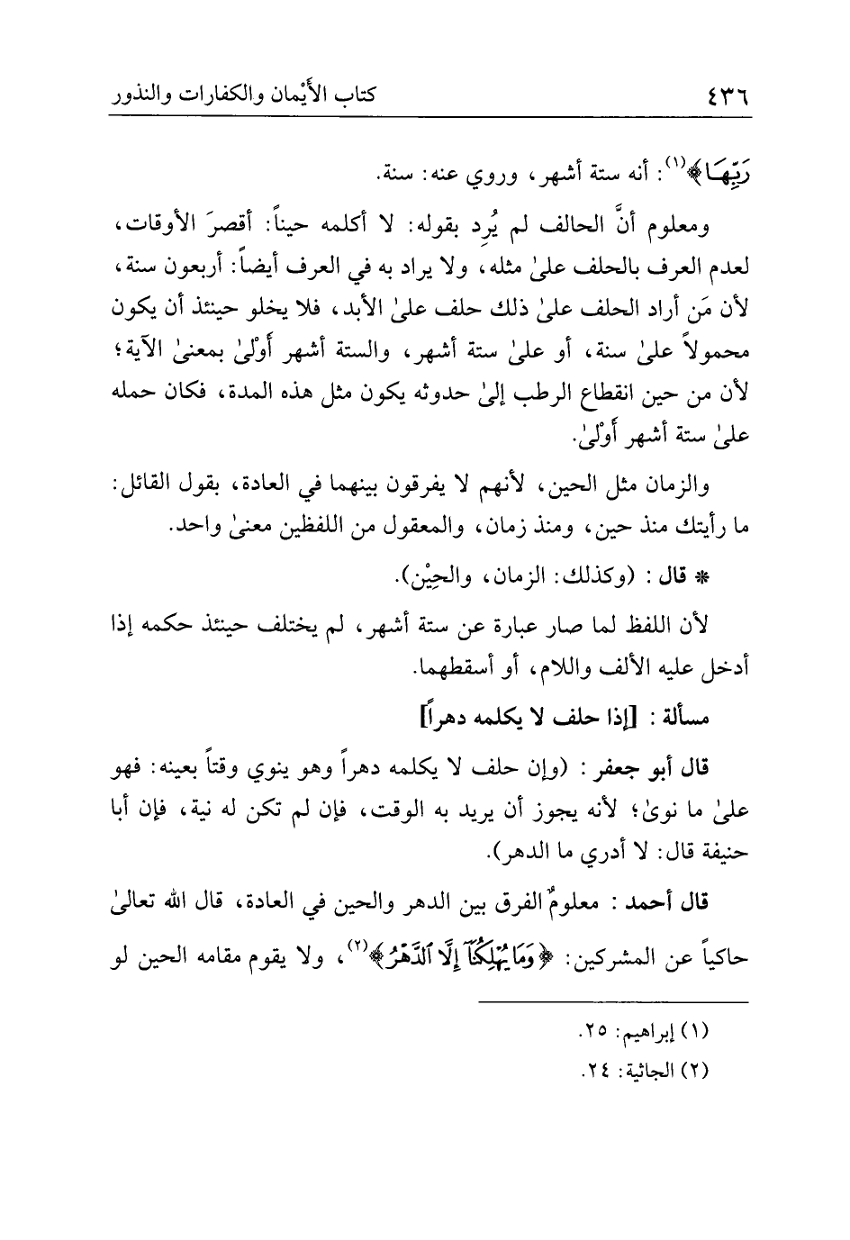 ومعلوم أنَّ الحالف لم يُرد بقوله: لا أكلمه حينًا: أقصر الأوقات، لعدم العرف بالحلف على مثله، ولا يراد به في العرف أيضًا: أربعون سنة، لأن من أراد الحلف على ذلك حلف على الأبد، فلا يخلو حينئذ أن يكون محمولاً على سنة، أو على ستة أشهر، والستة أشهر أولى بمعنى الآية؛ لأن من حين انقطاع الرطب إلى حدوثه يكون مثل هذه المدة، فكان حمله على ستة أشهر أولى.