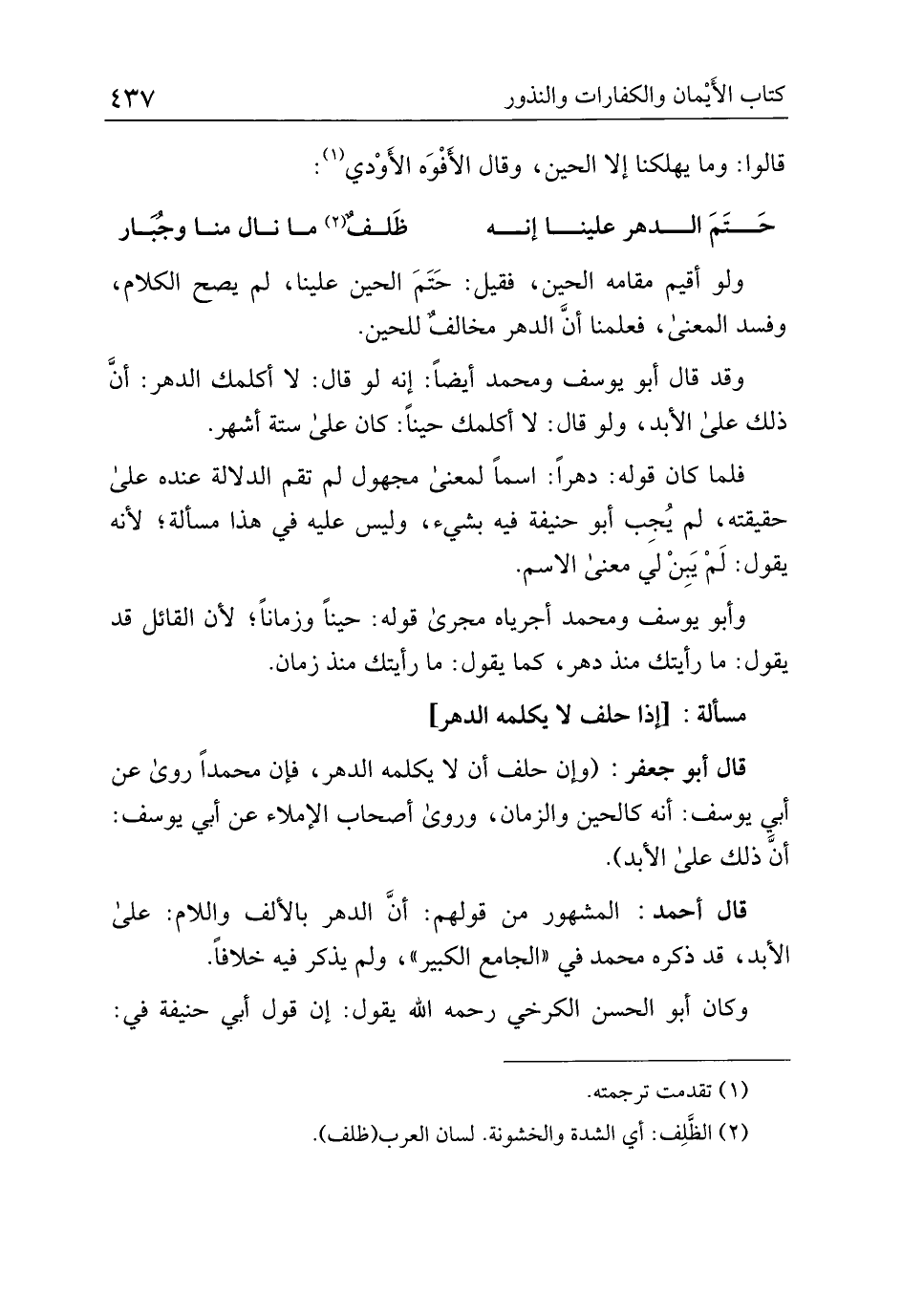 قال أبو جعفر: (وإن حلف أن لا يكلمه الدهر، فإن محمدًا روى عن أبي يوسف: أنه كالحين والزمان، وروى أصحاب الإملاء عن أبي يوسف: أنَّ ذلك على الأبد).