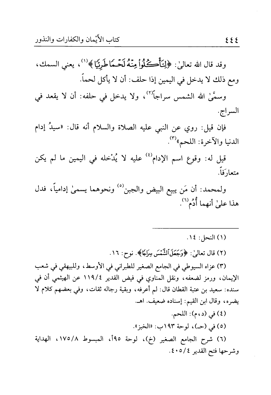 وسمى الله الشمس سراجًا، ولا يدخل في حلفه: أن لا يقعد في السراج.