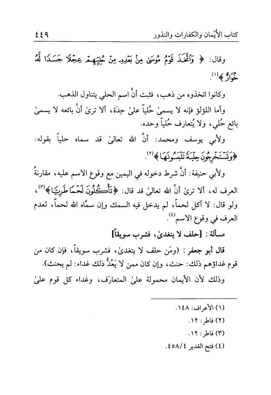 ولأبي حنيفة: أنَّ شرط دخوله في اليمين مع وقوع الاسم عليه، مقارنةُ العرف له، ألا ترى أنَّ الله تعالى قد قال: {تأكلون لحمًا طريًا}، ولو قال: لا آكل لحمًا، لم يدخل فيه السمك وإن سماه الله لحمًا، لعدم العرف في وقوع الاسم.