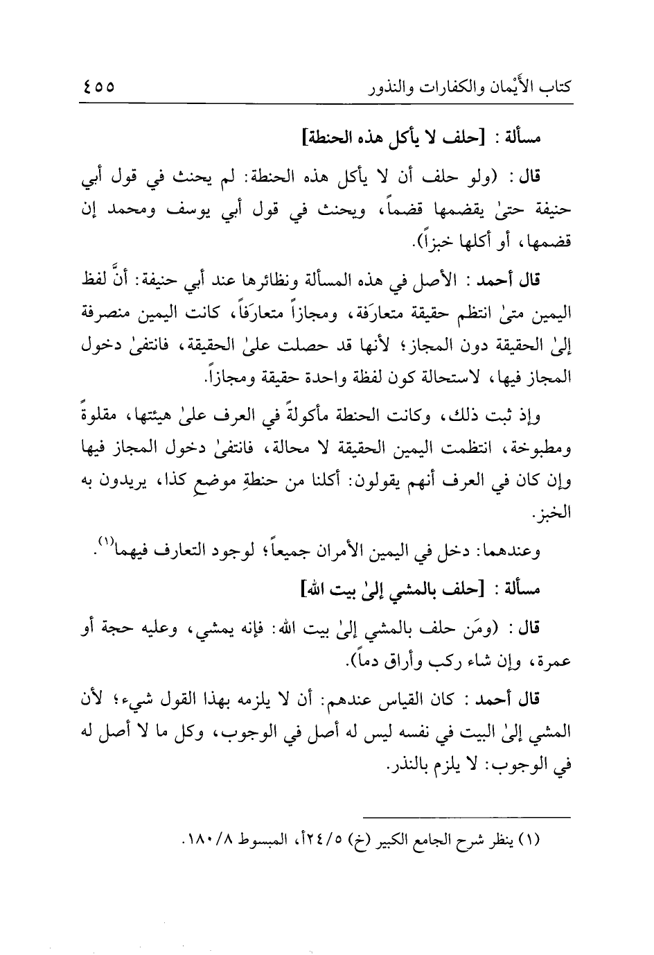 قال أحمد: الأصل في هذه المسألة ونظائرها عند أبي حنيفة: أنَّ لفظ اليمين متى انتظم حقيقة متعارفة، ومجازًا متعارفًا، كانت اليمين منصرفة إلى الحقيقة دون المجاز؛ لأنها قد حصلت على الحقيقة، فانتفى دخول المجاز فيها، لاستحالة كون لفظة واحدة حقيقة ومجازًا.