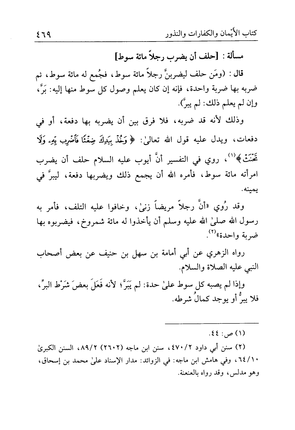 قال: (ومن حلف ليضربن رجلاً مائة سوط، فجمع له مائة سوط، ثم ضربه بها ضربة واحدة، فإنه إن كان يعلم وصول كل سوط منها إليه: بر، وإن لم يعلم ذلك: لم يبر).