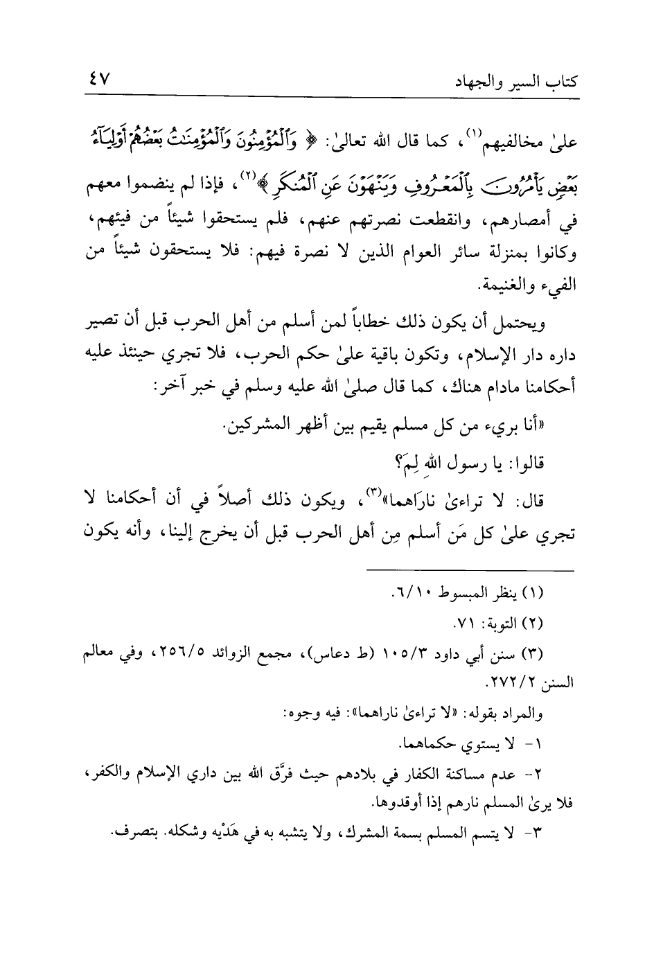 قال: لا تراءى ناراهما"، ويكون ذلك أصلًا في أن أحكامنا لا تجري على كل من أسلم من أهل الحرب قبل أن يخرج إلينا، وأنه يكون