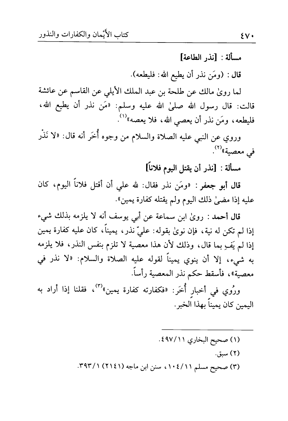 قال أحمد: روى ابن سماعة عن أبي يوسف أنه لا يلزمه بذلك شيء إذا لم تكن له نية، فإن نوى بقوله: عليّ نذر، يمينًا، كان عليه كفارة يمين إذا لم يَفِ بما قال، وذلك لأن هذا معصية لا تلزم بنفس النذر، فلا يلزمه به شيء، إلا أن ينوي يمينًا لقوله عليه الصلاة والسلام: "لا نذر في معصية"، فأسقط حكم نذر المعصية رأسًا.
