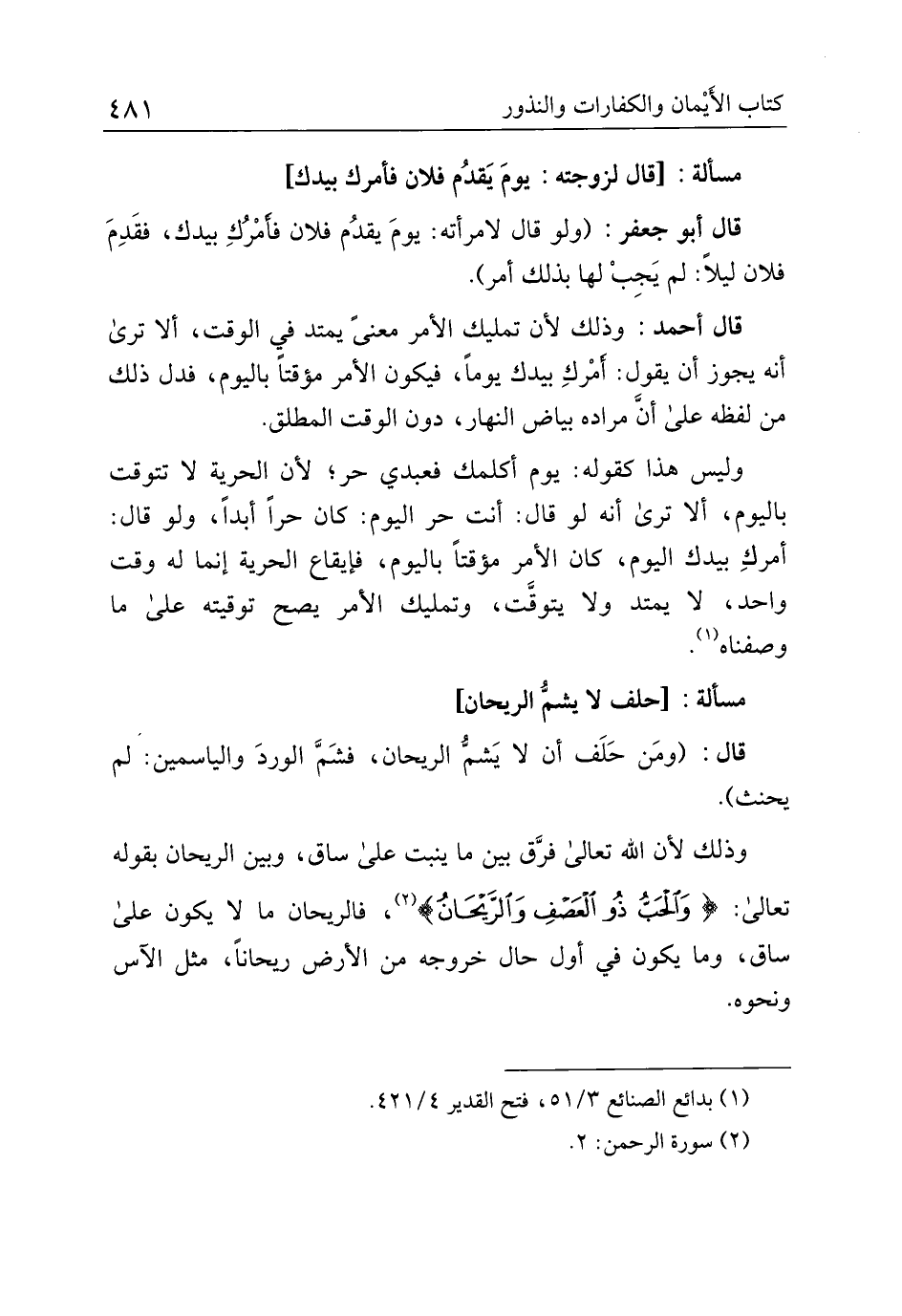 قال أحمد: وذلك لأن تمليك الأمر معنى يمتد في الوقت، ألا ترى أنه يجوز أن يقول: أمرك بيدك يومًا، فيكون الأمر مؤقتًا باليوم، فدل ذلك من لفظه على أنَّ مراده بياض النهار، دون الوقت المطلق.