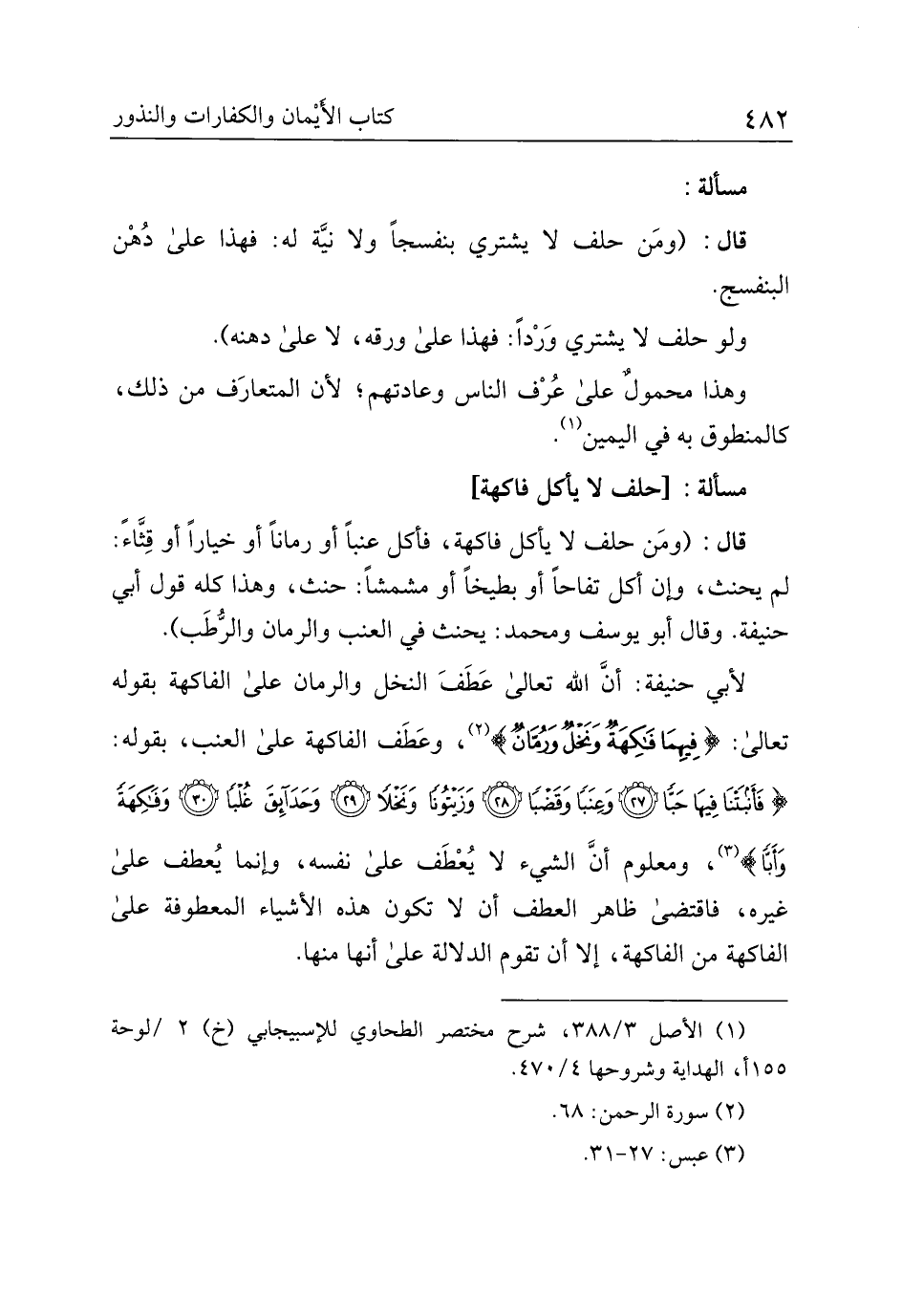 لأبي حنيفة: أن الله تعالى عطف النخل والرمان على الفاكهة بقوله تعالى: {فيهما فاكهة ونخل ورمان}، وعطف الفاكهة على العنب، بقوله: {فأنبتنا فيها حبًا وعنبًا وقضبًا وزيتونًا ونخلاً وحدائقً غلبًا وفاكهةً وأبًا}، ومعلوم أنَّ الشيء لا يُعْطف على نفسه، وإنما يعطف على غيره، فاقتضى ظاهر العطف أن لا تكون هذه الأشياء المعطوفة على الفاكهة من الفاكهة، إلا أن تقوم الدلالة على أنها منها.