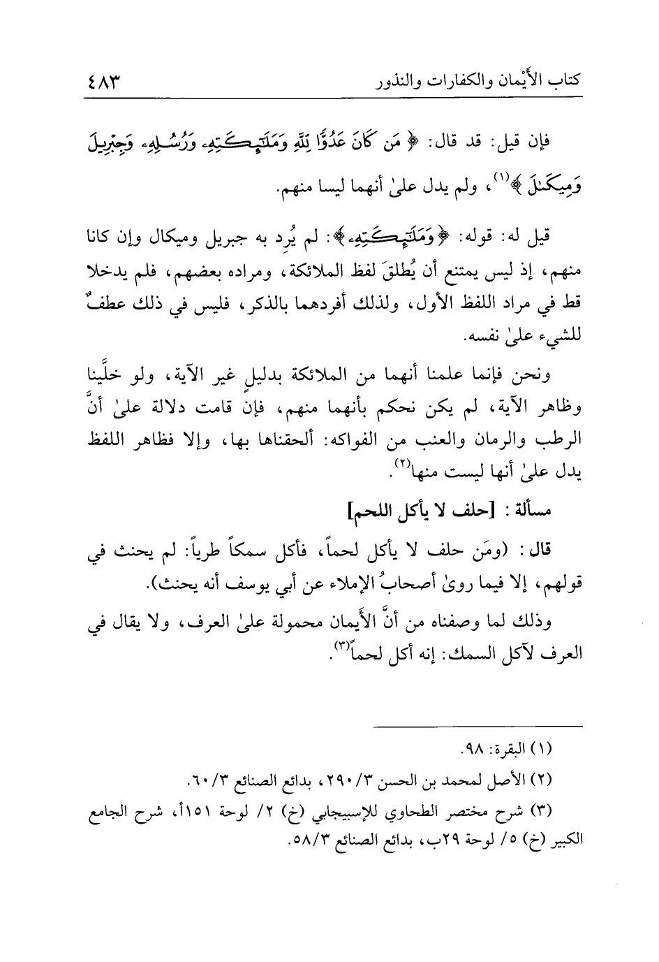 قال: (ومن حلف لا يأكل لحمًا، فأكل سمكًا طريًا: لم يحنث في قولهم، إلا فيما روى أصحاب الإملاء عن أبي يوسف أنه يحنث).
