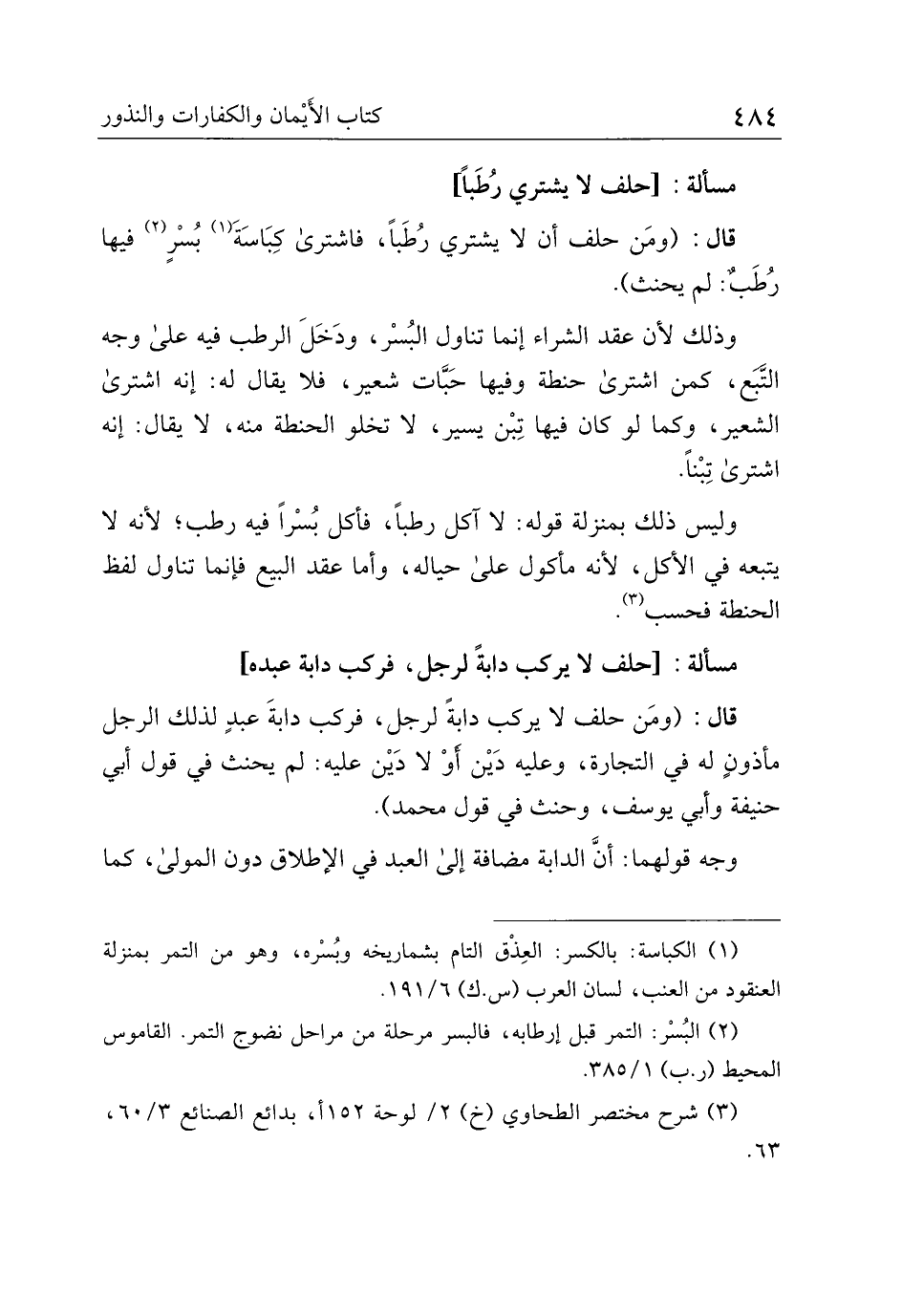 وليس ذلك بمنزلة قوله: لا آكل رطبًا، فأكل بُسرًا فيه رطب؛ لأنه لا يتبعه في الأكل، لأنه مأكول على حياله، وأما عقد البيع فإنما تناول لفظ الحنطة فحسب.